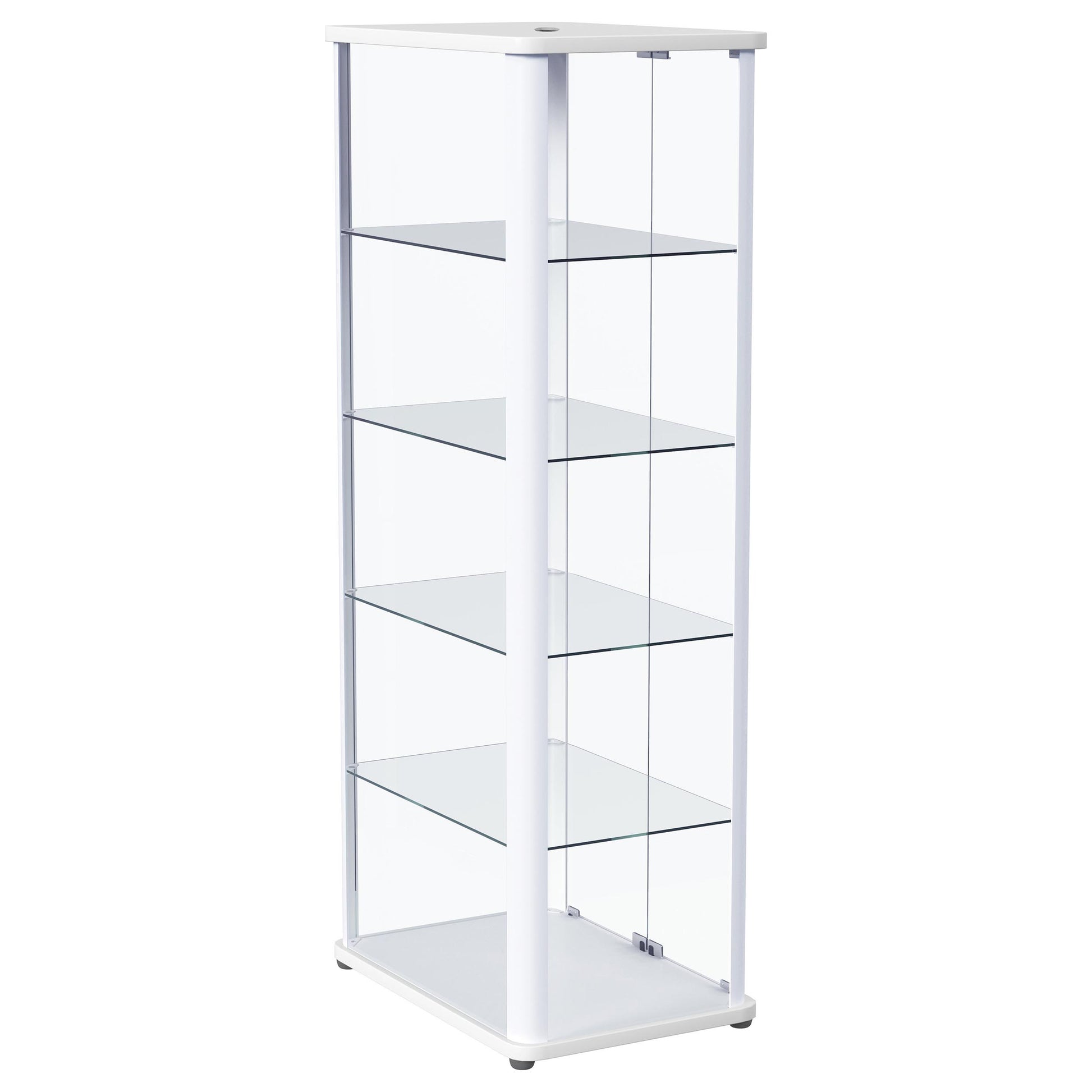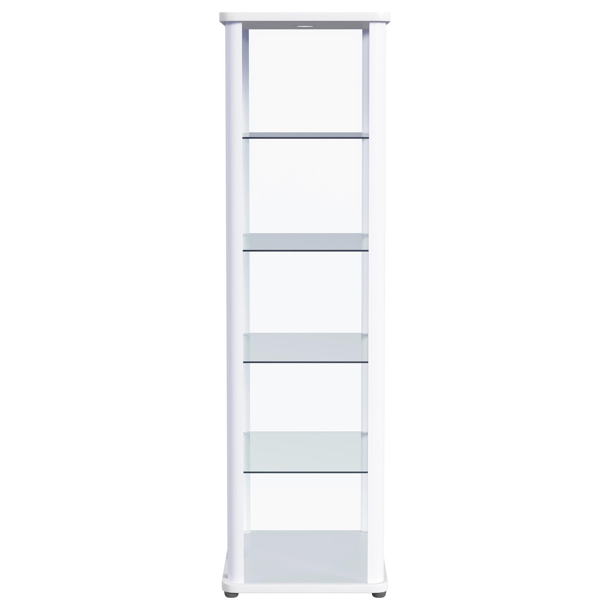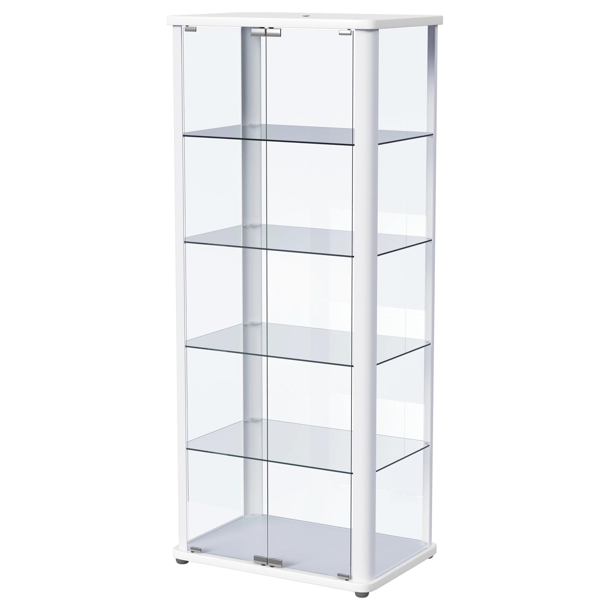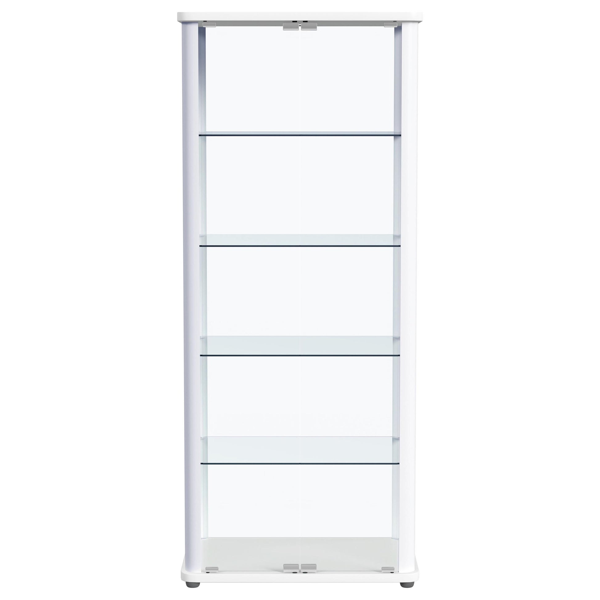 Gather all your favorite things and show them off to their best effect in a modern glass curio cabinet. Perfect for everything from China in the dining room to sculpture and art in your living area, the cabinet features rounded corners and a neutral finish, offering crisp style in any setting. Its glass sides and back are complemented with a pair of clear glass doors, offering a full view of items placed within. Four glass shelves hold an impressive number of treasures, creating a curated display you'll love. Recessed lighting completes the look to perfection.