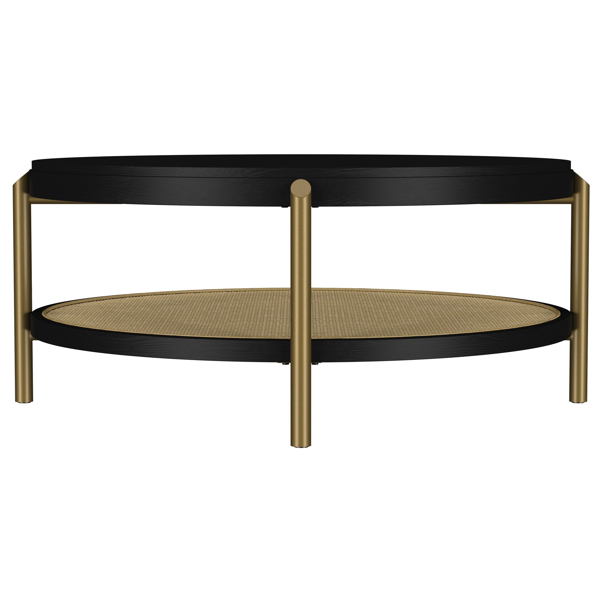 This round coffee table combines modern design with rustic charm, perfect for today’s living spaces. Crafted with rubberwood, engineered wood, and white ash veneer, its smooth finish highlights the natural wood grain for an organic appeal. The lower shelf features woven rattan, offering practical storage and a textured look. Supported by aged brass-finished metal legs, this cocktail table delivers a balance of durability and style, serving as a functional centerpiece for any living room or lounge area.
