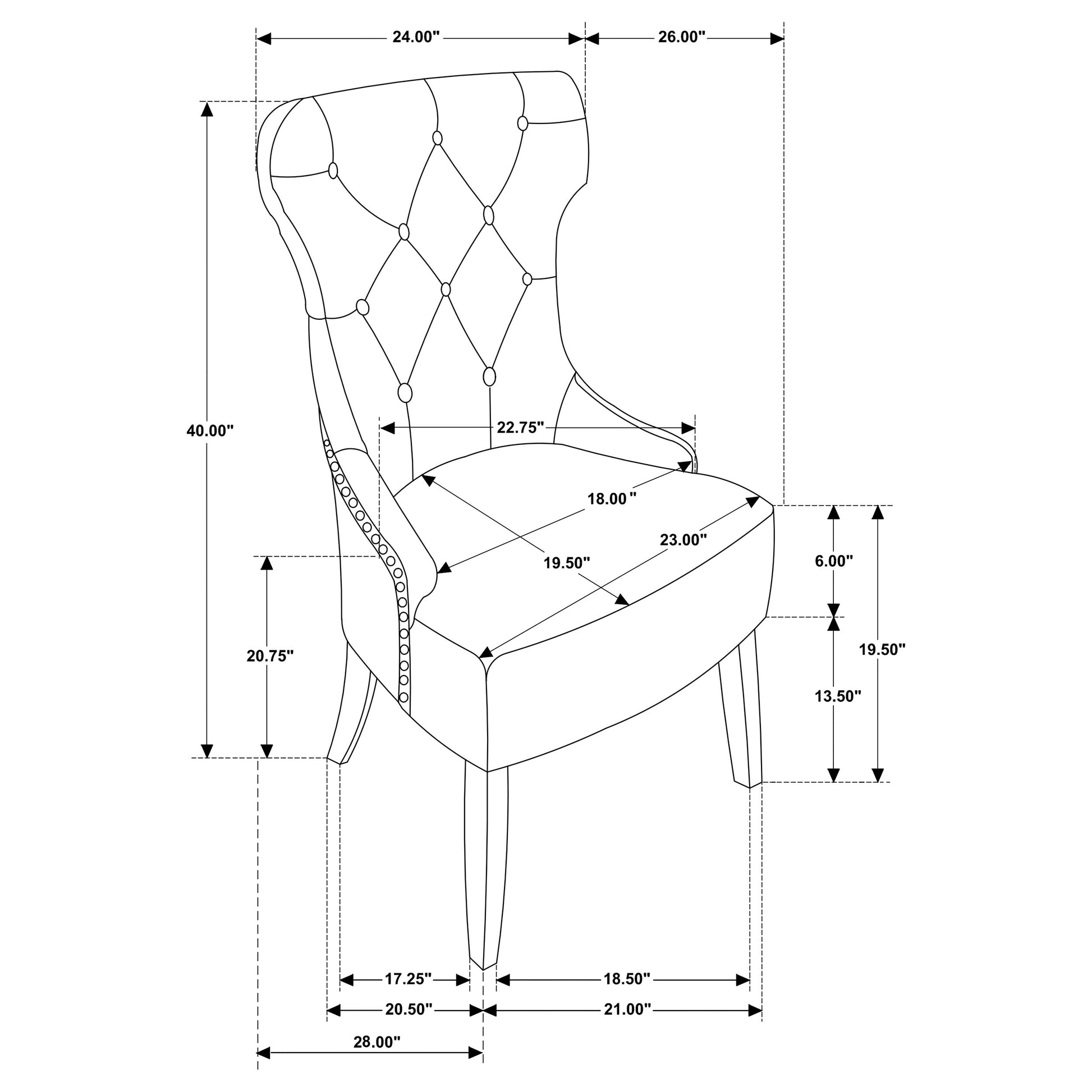 Enjoy an intriguing silhouette with a classic look. Graceful curves and angles form an eye-catching design in this dining chair. Perfect for transitional spaces, its modern design is softened with lovely beige upholstery and tufting on its seat back. Individually hand-applied nailhead trim infuses charm and style. Beautifully contrasting legs in a warm brown finish add a balanced look with curves and tapers.
