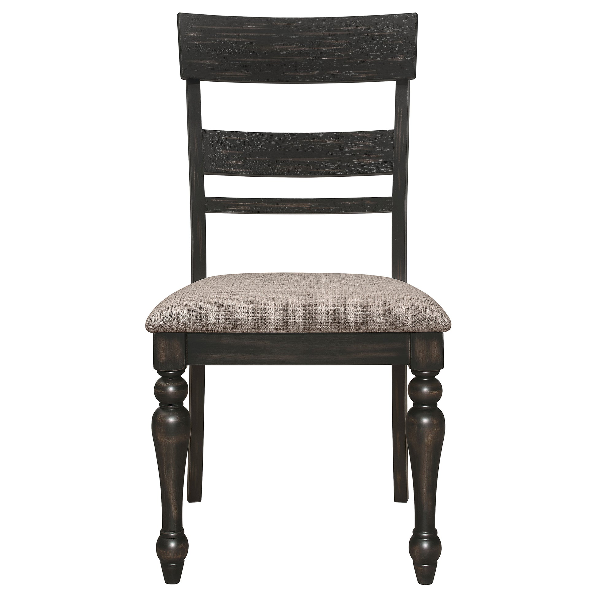 Make your traditional dining area a space for easy conversation and beautiful style. This seven-piece dining set brings out the best in a hybrid aesthetic of farmhouse and mid-century looks with a soft, versatile color and finish palette and construction of rubberwoods and wood products. A rectangular table mixes finishes between its brown brushed finish top and a glam charcoal sand through finish base and legs. Curvy lines and turned legs add an alluring feel to a table playing host to brown finish ladderback chairs. A smoothly arched side silhouette with turned front legs creates an elegant look, embellished with neutral and soft stone brown fabric seat upholstery.