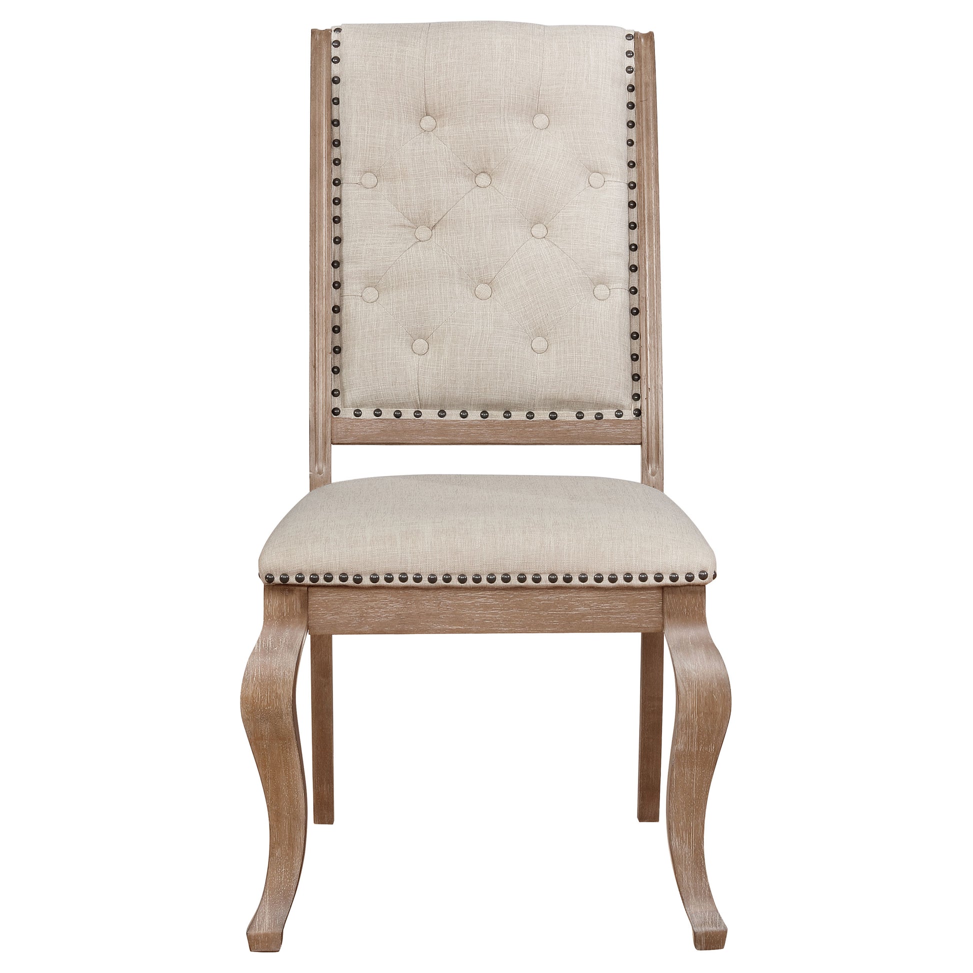 Terrifically transitional with subtle glam details comes this wood and upholstered dining set. Including a 20” removable extension leaf, this beautiful wood dining table is finished in a natural wood color with distressed wood grain accents. The dual pedestal base offers a final touch of traditional appeal. Find gorgeous coordinating dining chairs, upholstered in cream fabric. The dining chairs are adorned with individually applied nailhead trim with cabriole style legs for a finishing touch.