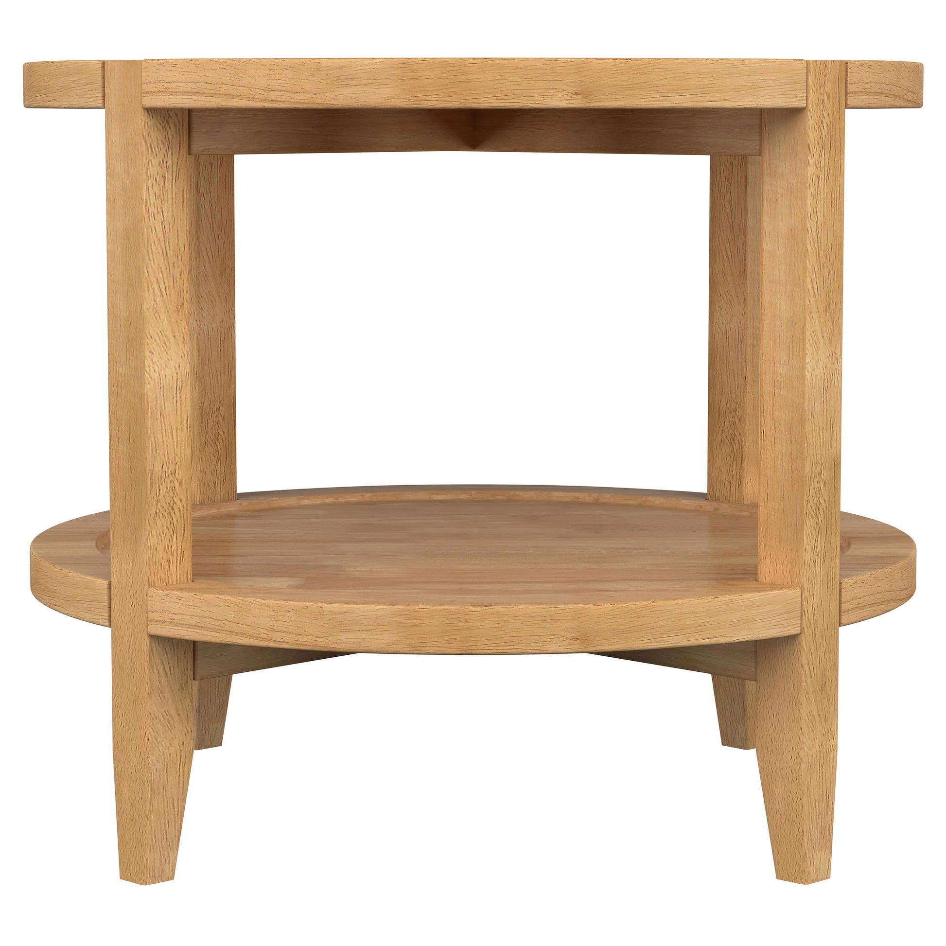 Encourage a warm, welcoming ambiance with the choice of a modern farmhouse end table. Its round profile is crisp and familiar, while offering movement and flowing energy. The table is crafted in rubberwood for optimal quality and received a warm maple finish that's stylish without overwhelming surrounding decor. A slight tray effect adds depth the tabletop and lower shelf, creating another touch of texture and dimension. The table is designed with a full lower shelf, offering a perfect spot for a personalized display of books or other decor.