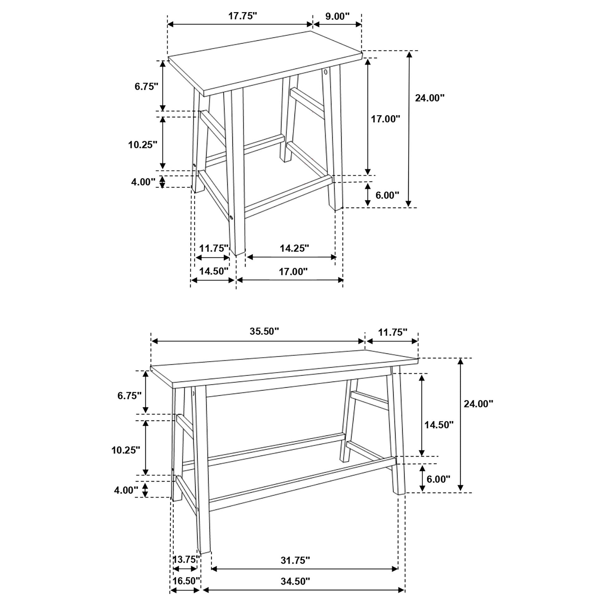 A charming addition to a kitchen breakfast nook or compact dining area, this country four-piece counter height table set gives off modern farmhouse vibes. A two-tone finish offers a subtle contrast and rustic-inspired design. A chestnut finish covers the tops of the table, stools and bench, as the rest on a bold, dark brown finish frame. The narrow rectangular counter height table features a trestle base and straight square legs for a clean lined effect. In addition, the two stools and bench also offer a similar style with square legs that flare out toward the feet and offer a footrest for extra support.