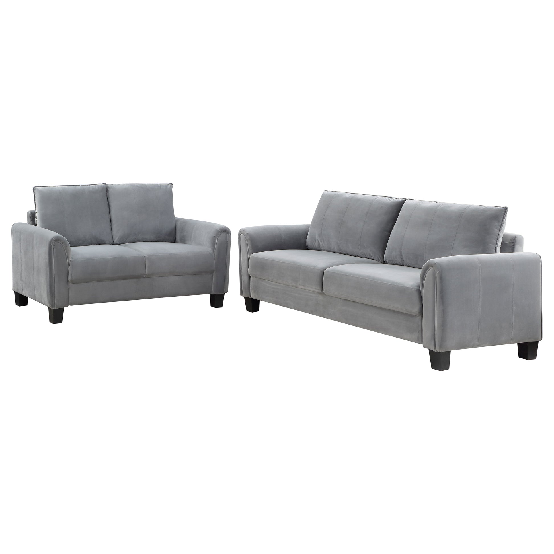 Create a welcoming, refined living space with a modern two-piece sofa set. Each is upholstered in velvety soft gray fabric, with stitching accents that add depth and detail. Plush cushions include reversible back pillows, with sinuous spring decking under seats to ensure support and comfort. Rounded arms define its structured silhouette, complete with piping trim and subtle pleating that adds dimension. Add colorful accent pillows to bring a personalized touch.
