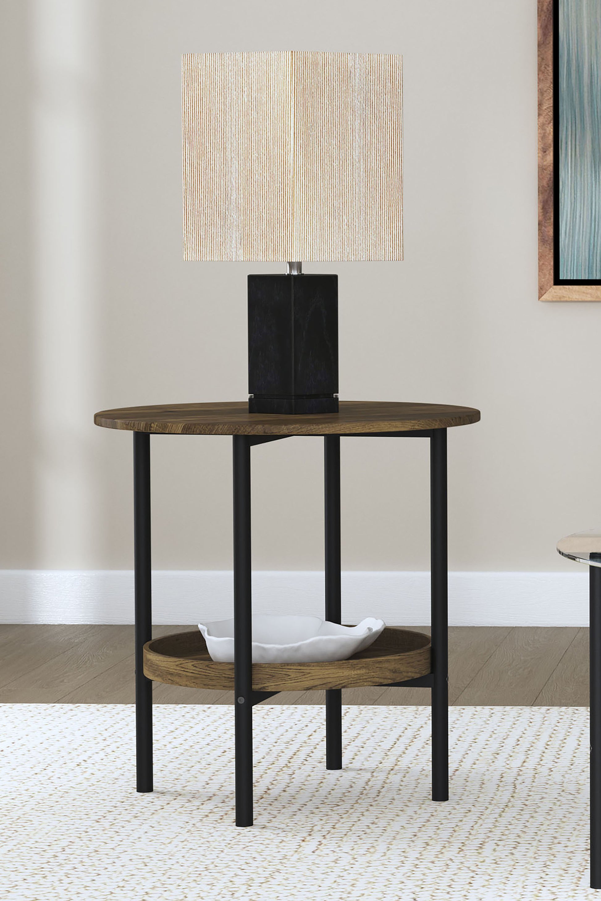 Complement your living space with the stylish, understated design of this transitional round end table. Its simple, clean lines exude farmhouse charm, with a neutral brown wood finish that brings warmth to any room. The round silhouette creates a sense of flow, while the full lower shelf, with its tray profile, offers a perfect spot for displaying your favorite decor or storing essentials. The black metal frame with tubular legs adds a crisp, classic touch to this versatile side table.