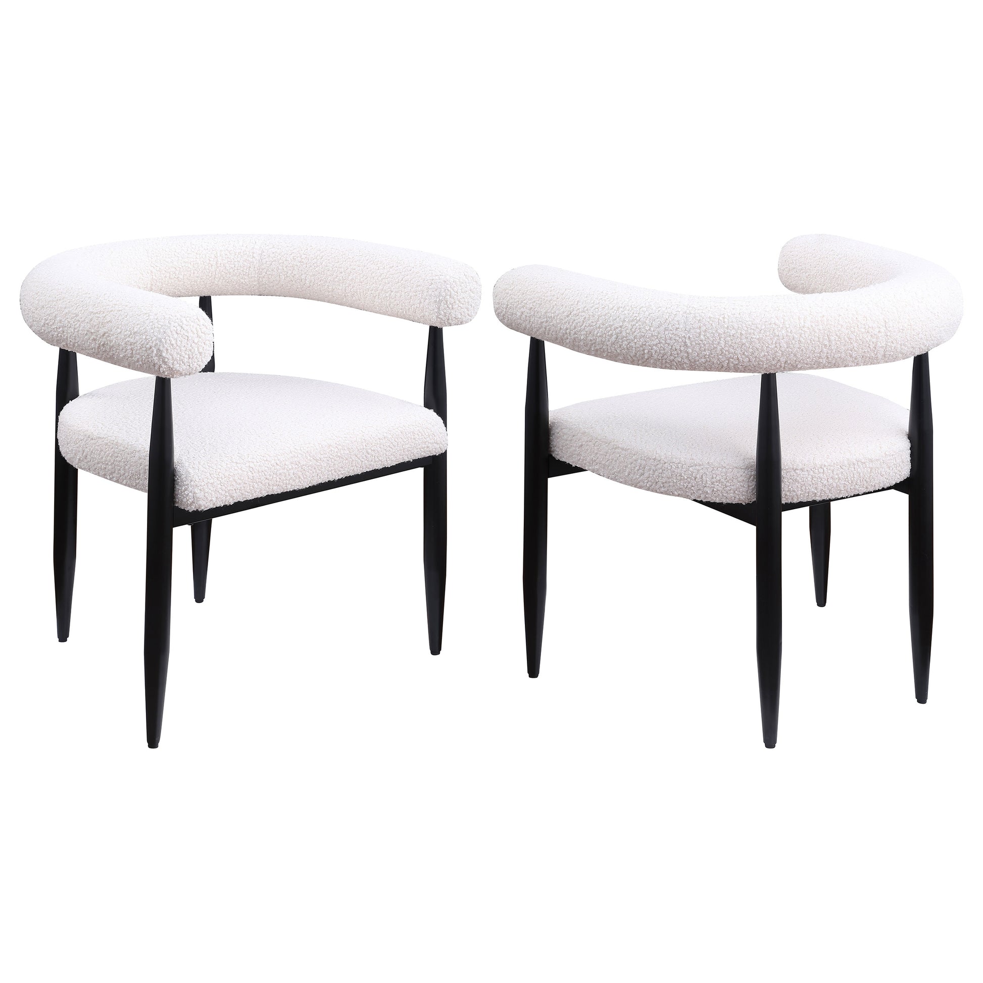 Create a fresh, modern accent in your living room or foyer with a modern armchair that blends Mid-century modern elements with a touch of contemporary flair. Its metal frame is solid and durable, with a light airy look and feel. The chair pairs a black finish with tapering legs, accentuating a contemporary look. The upholstery is a plush 100% polyester teddy fabric in a soft, warm cream color that complements any setting. The chair features an open C-shaped backrest, a unique twist on the original U-shaped back and armrests, that highlights its impressive silhouette to bring distinctive flair to your space. This blend of styles and textures creates a chair that is both comfortable and stylish, perfect for any modern home.