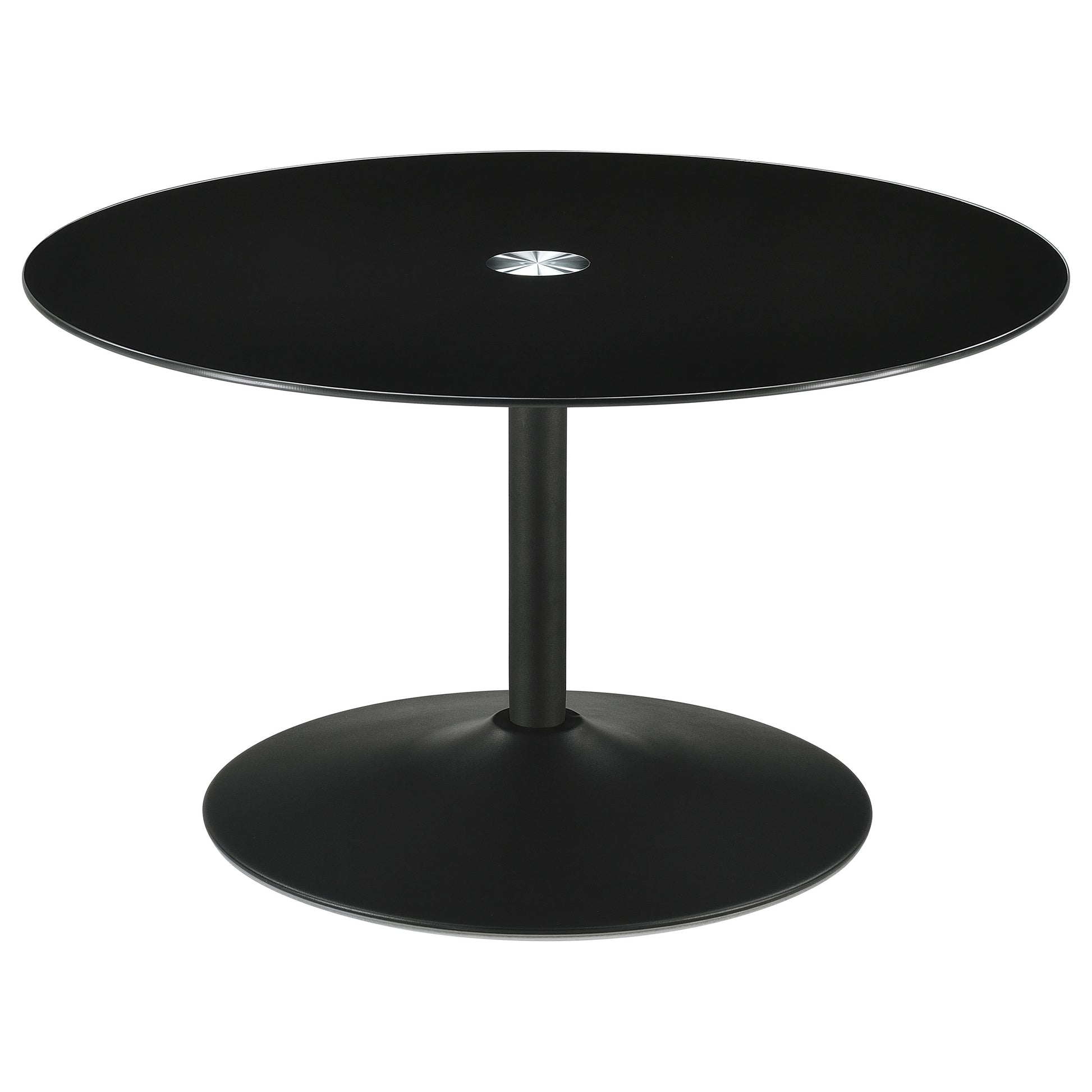 • Coffee table with a durable, round black tempered glass top for a modern look