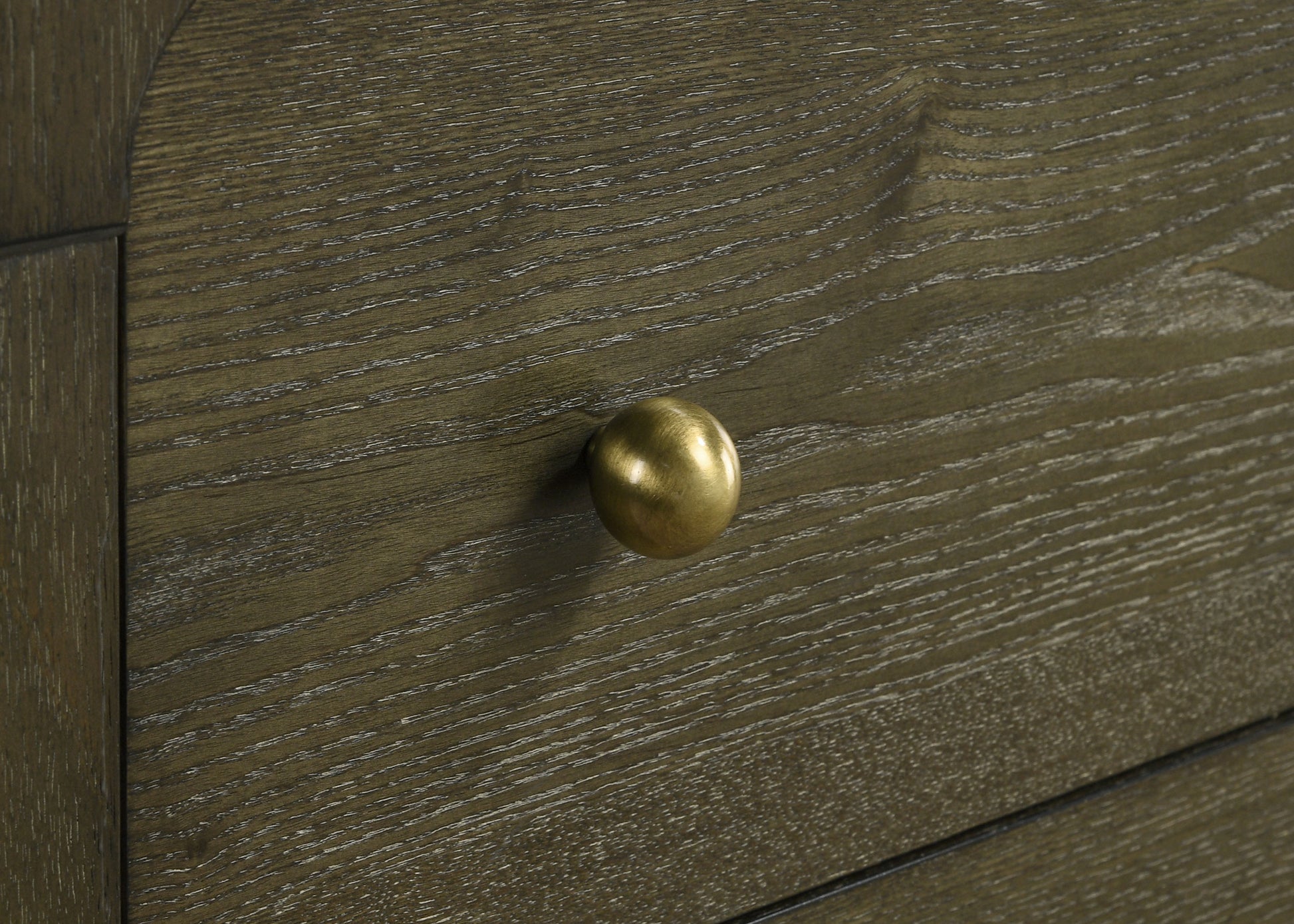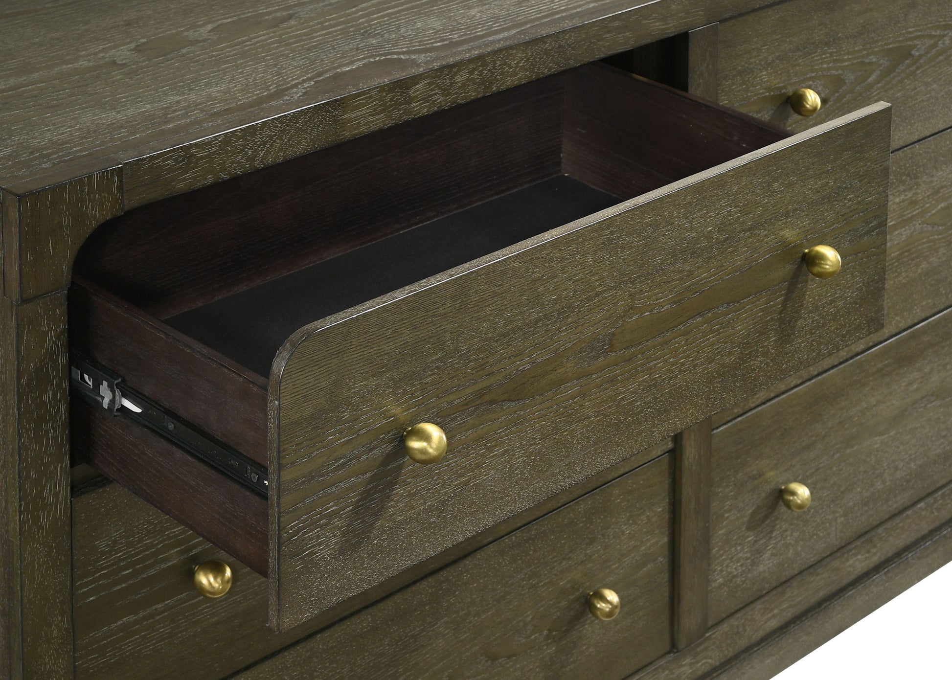 Add a touch of elegance to your bedroom with this spacious dresser, featuring a transitional design with rounded corners and trending details. The dark cocoa finish and brass knobs complement the sophisticated style, while the solid wood drawer box with English dovetail joinery ensures durability. The dresser includes felt-lined top drawers and 45mm metal ball-bearing glides for smooth functionality. Crafted from solid hardwood, ash veneer, and MDF, this dresser combines style and practicality.
