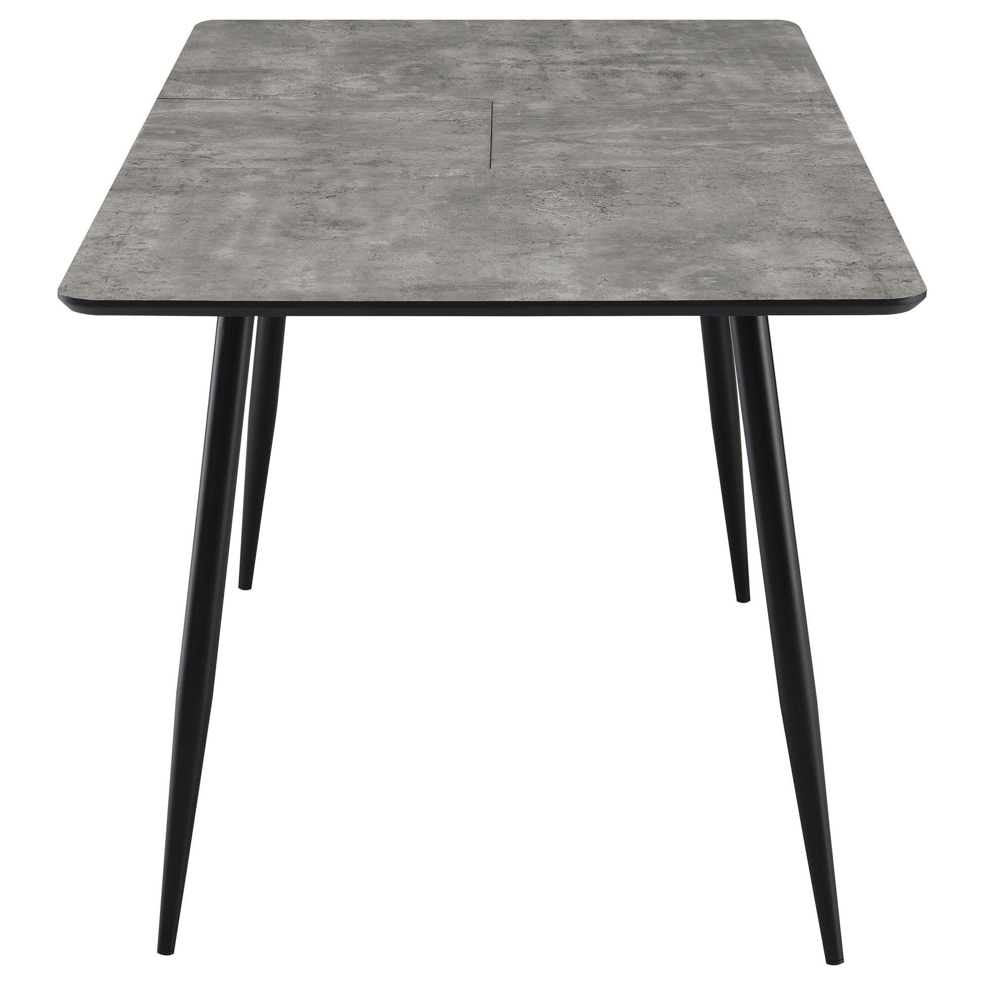This modern dining set pairs a versatile dining table with sleek dining chairs for a cohesive and contemporary look. The dining table features a 15. 75-inch butterfly leaf, extending from 47. 25 to 63 inches to accommodate guests with ease. Its HD melamine tabletop over MDF offers a scratch- and water-resistant surface, supported by black powder-coated metal tapered legs. Complementing the table are grey linen-like upholstered dining chairs, designed with contoured backrests, foam-padded seats, and sturdy black powder-coated metal legs for comfort and style.