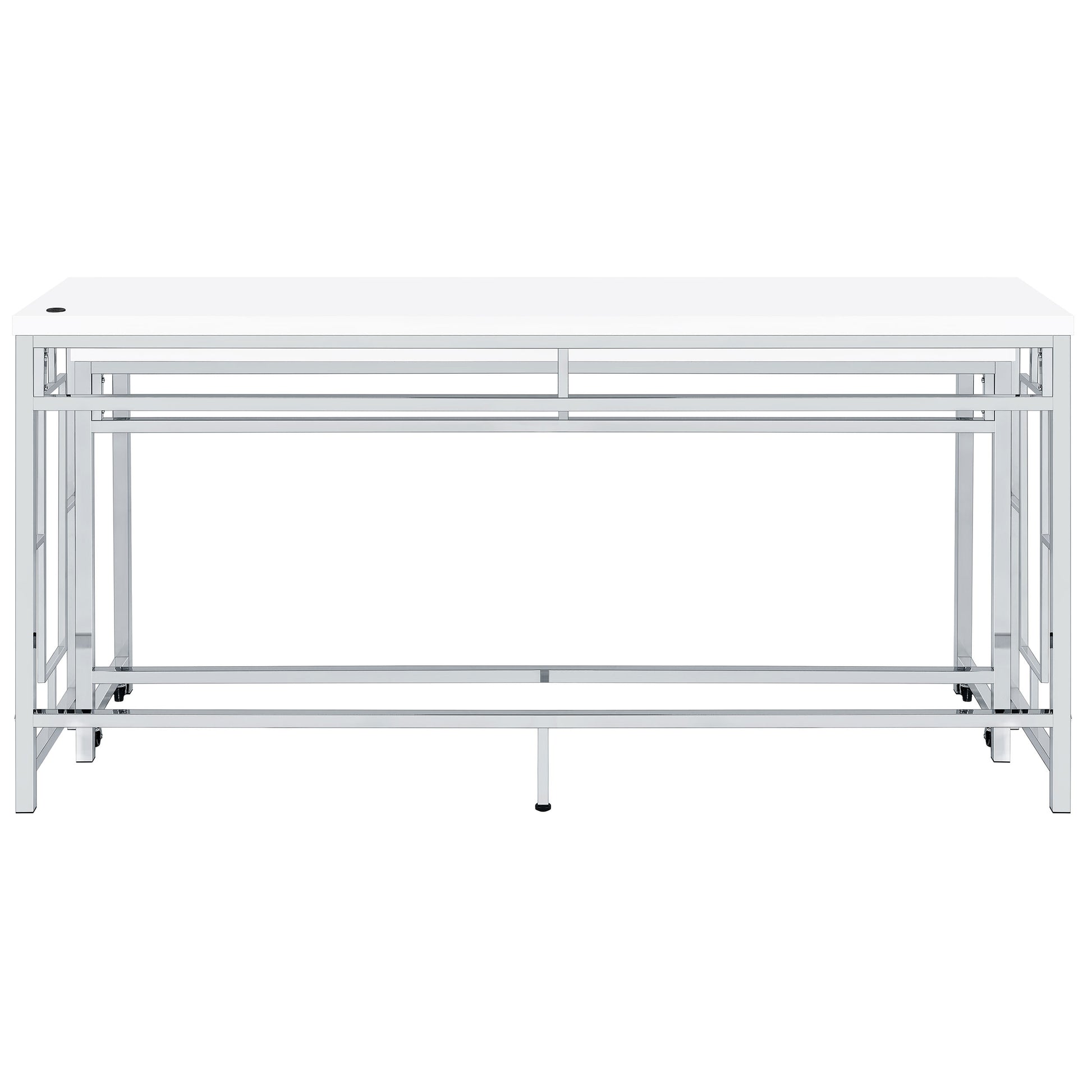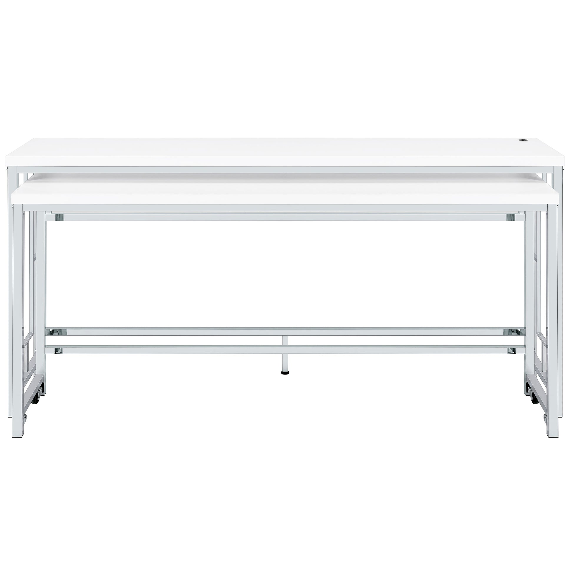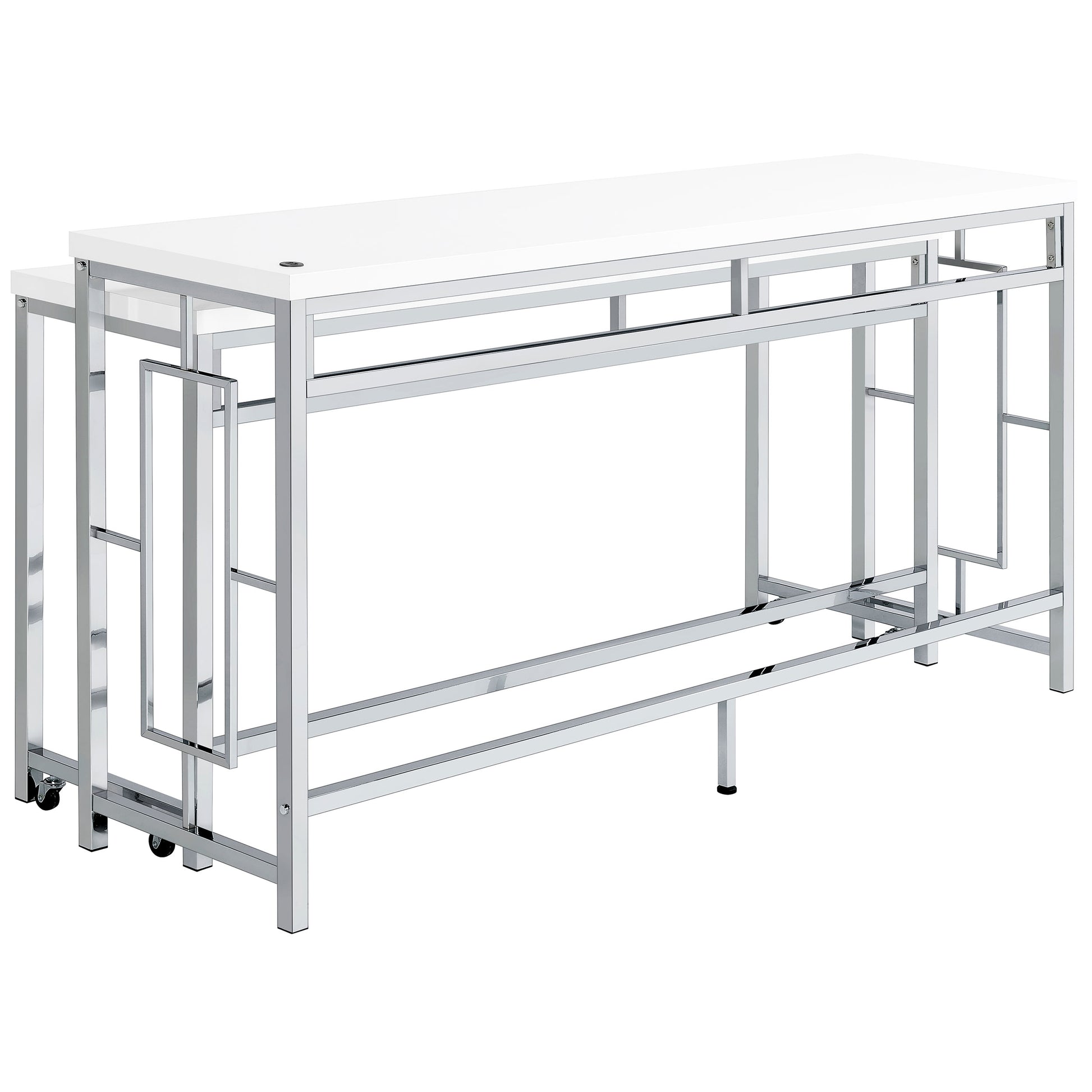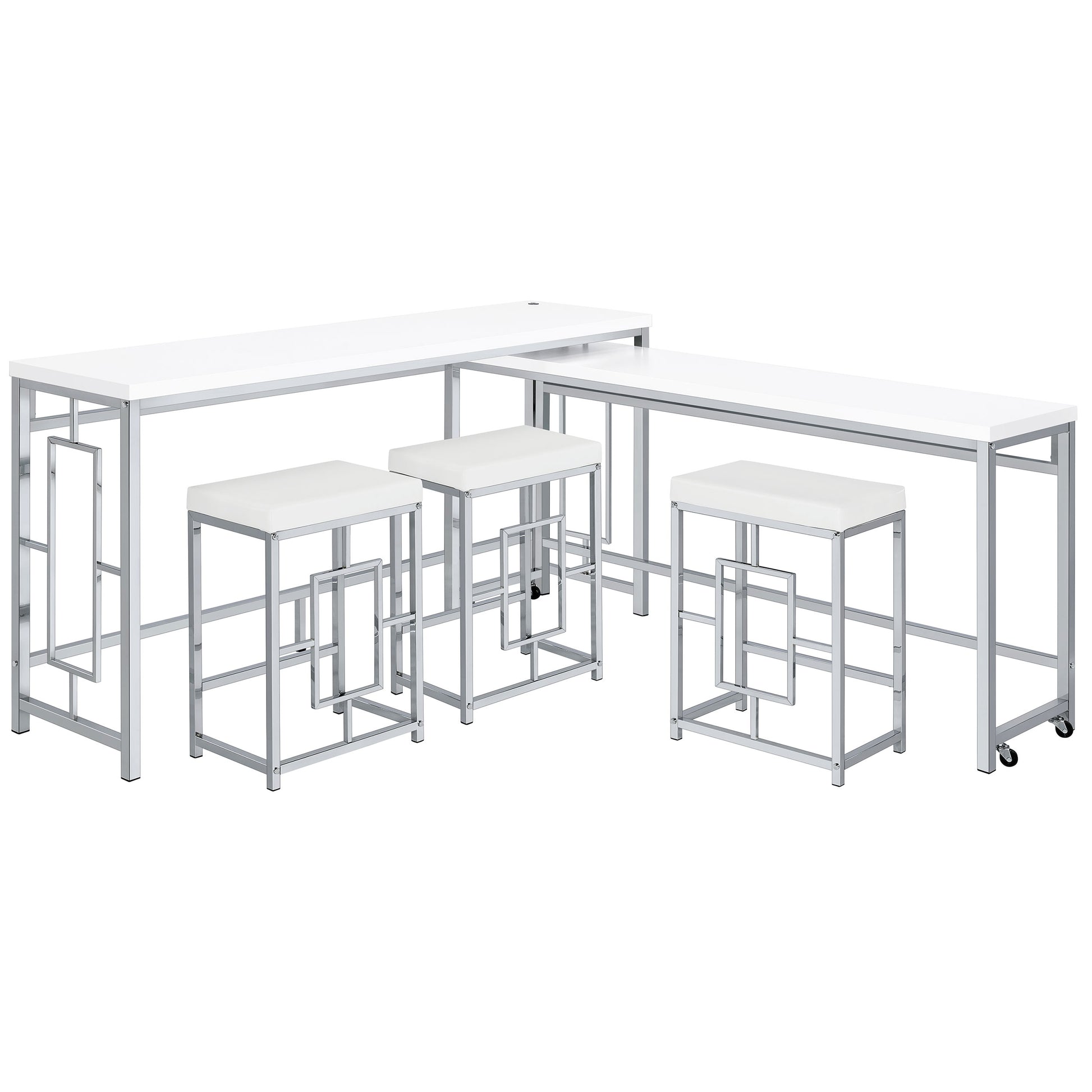 We love this modern five-piece counter height dining set in place of a console behind a floating sofa, offering exceptional versatility and refined style in any setting. It boasts two nesting tables, each long and narrow like a sofa table, but paired with three backless stools that tuck underneath. It's the perfect spot for drinks with friends on game day, or setting yourself up to work from home on a snowy day. The silver and white set features a larger table with wheels on the smaller table to create any configuration that works for you. Stools are decorated with artistic bases with open, floating frames that add Deco flair and white faux leather upholstery over padded seats for optimal comfort.