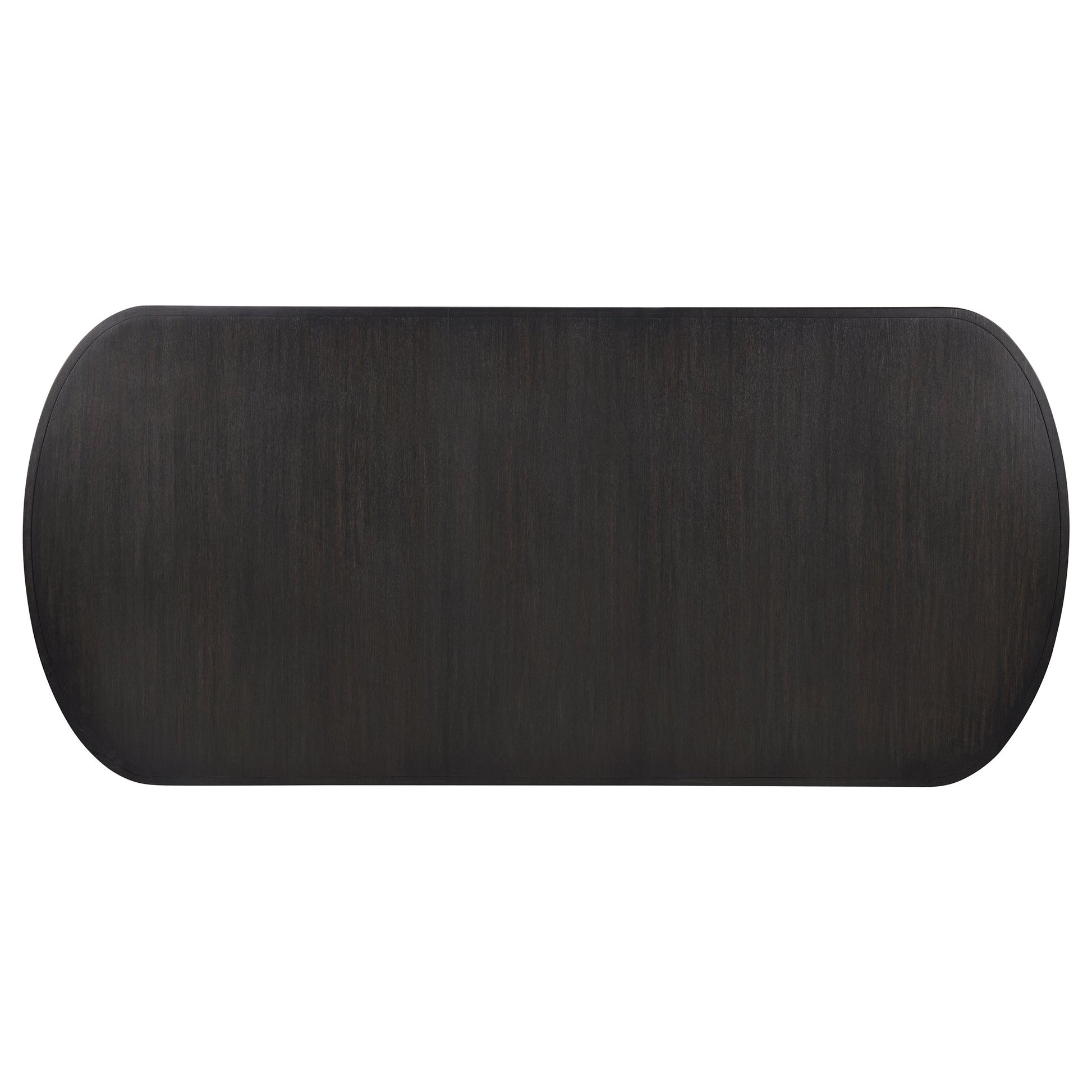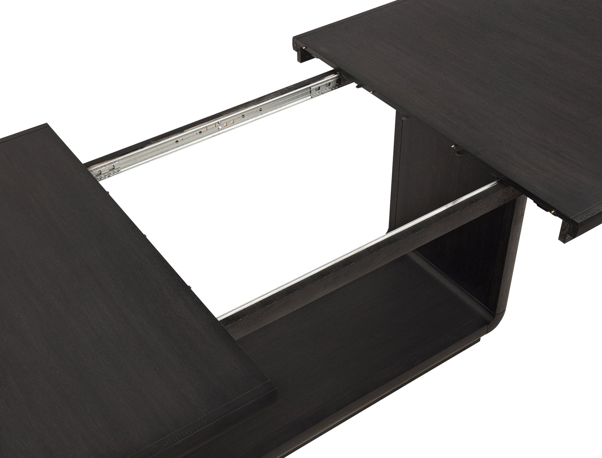 Designed for connection and crafted with grace, this dining set brings architectural beauty to everyday meals and special gatherings alike. A rectangular extension table, finished in burnished black, expands with a removable leaf and smooth cable glides to accommodate more seats with ease. At each end, sculpted arm chairs with curved barrel backs invite relaxed elegance, while channeled side chairs line the center with tailored texture. The result is a perfectly balanced setting—bold, welcoming, and timeless.