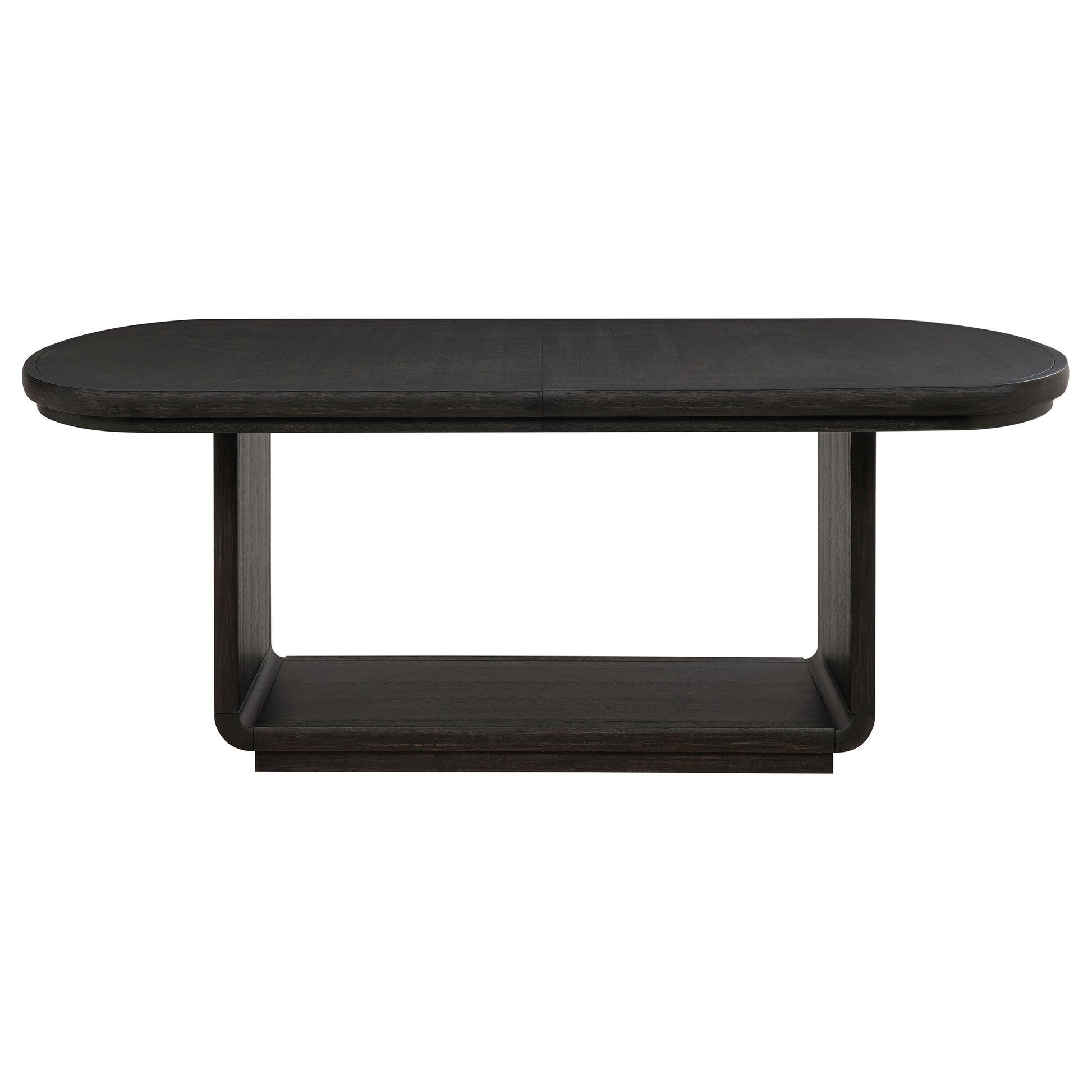 Rooted in quiet strength and sculptural beauty, this extension dining table brings graceful presence to every gathering. Its soft-edged rectangular top rests on a bold pedestal base, finished in burnished black for depth and contrast. When needed, a removable leaf extends the surface with the help of equalizing metal cable glides, allowing for smooth expansion. Whether hosting intimate dinners or festive occasions, this table adapts with effortless elegance.