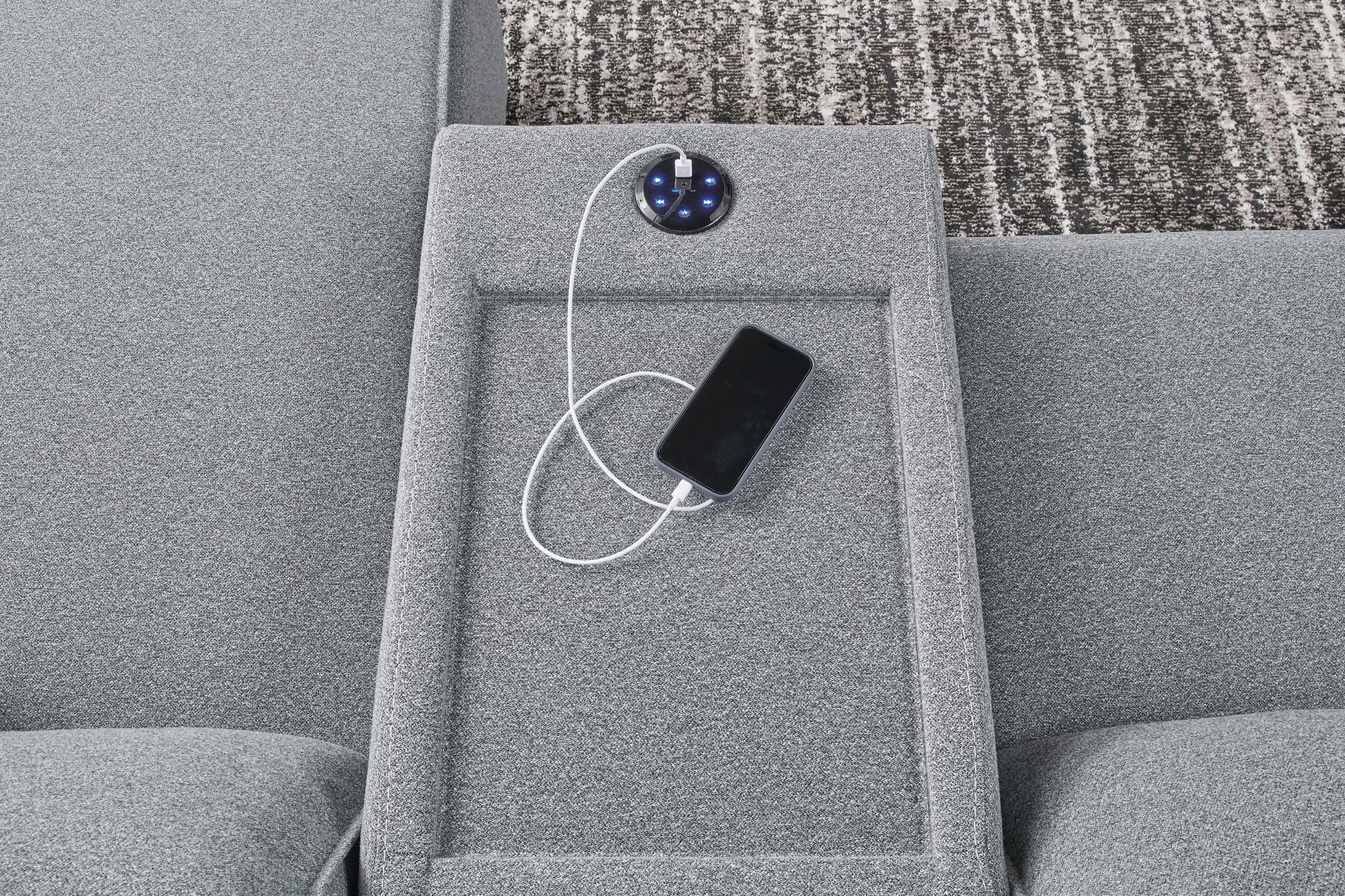 Details | Includes 6 modular pieces: left-arm facing power recliner, power armless recliner, armless chair, console, wedge and right-arm facing power recliner, "Left-arm" and "right-arm" describe the position of the arm when you face the piece, Versatile modular pieces fit together in a variety of configurations, One-touch power control with adjustable positions, Easy View™ adjustable headrest and zero-draw USB port, Zero-draw technology only consumes power when the USB receptacle is in use, Corner-blocked frame with metal reinforced seat, Attached seat and back cushions; high-quality foam cushions wrapped in poly fiber, Polyester upholstery; Next-Gen Nuvella™ is a family-friendly fabric that is soft, easy to clean, stain-resistant and durable, Clean fabric with mild soap and water, let air dry; for stubborn stains, use a solution of 4 oz. bleach to 28 oz. water, Throw pillows with easy-to-remove zippered covers for machine washing; pillows with soft polyfill, Console with plexiglass top and 2 cup holders, Zero wall recliner design requires minimal space between wall and chair back, Power cord included; UL Listed | |