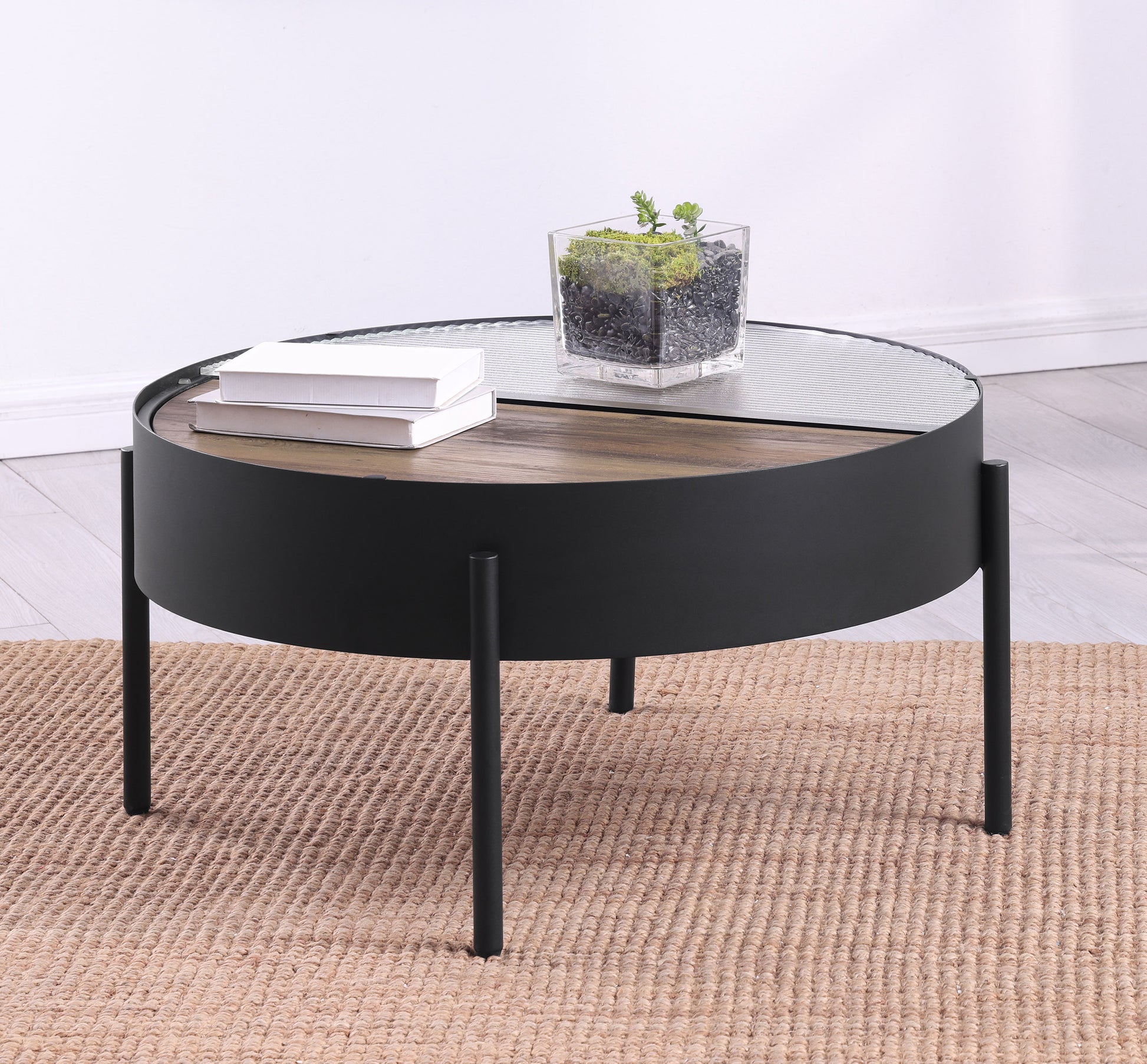This sleek coffee table merges modern function with a minimalist aesthetic. Half of its circular center table top showcases tempered reeded glass, while the other half features a sliding wood surface crafted from engineered wood and scratch-resistant and eco-friendly laminate veneer, revealing hidden storage. The black metal frame supports a dynamic cocktail table that seamlessly blends rustic warmth and contemporary flair, making it an accent table or low table centerpiece.