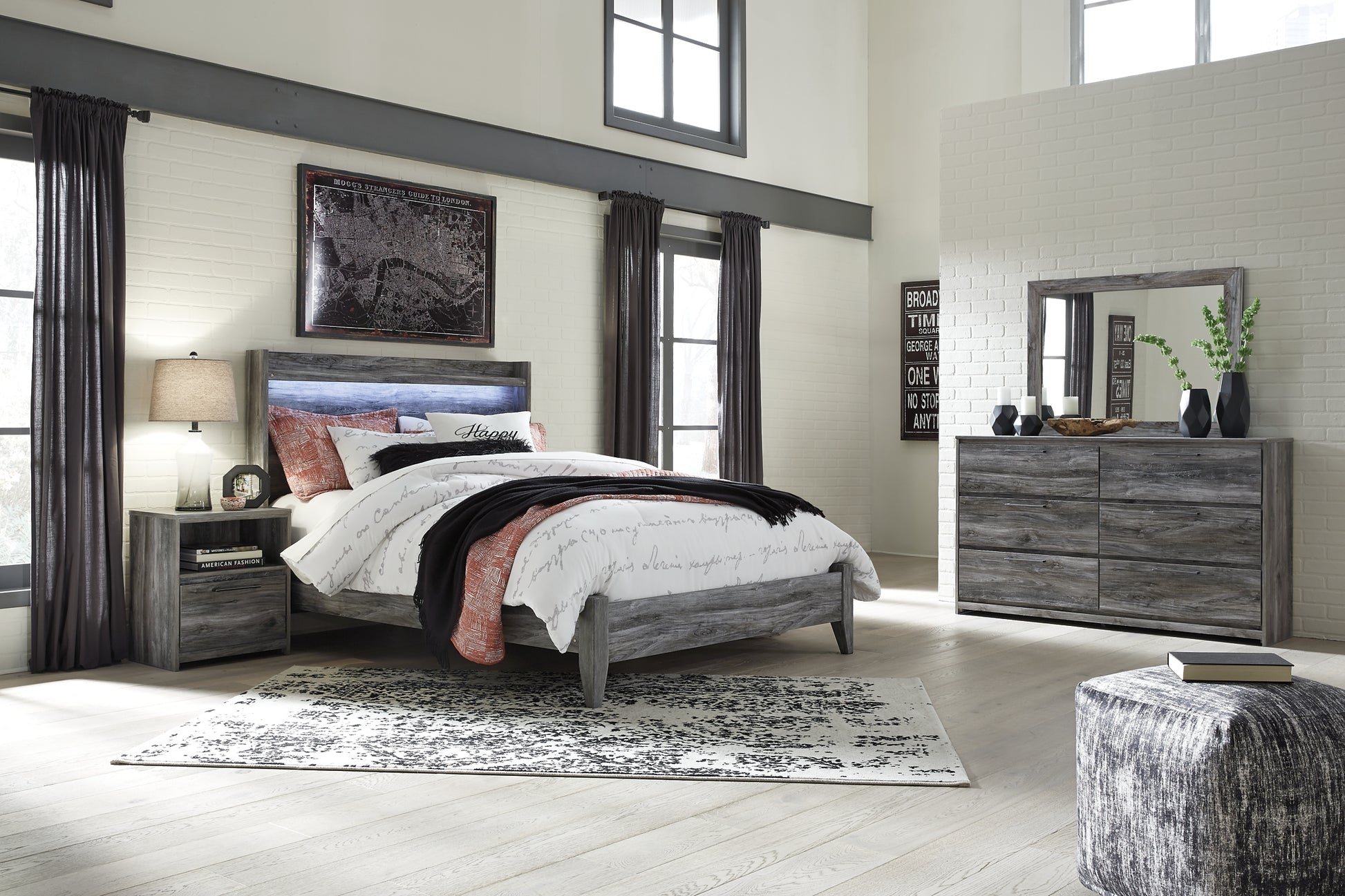 Details | B221B2: Includes headboard, footboard and rails, Made with engineered wood (MDF/particleboard) and decorative laminate, Smoky gray finish over replicated oak grain with authentic touch, Foundation/box spring required, sold separately, Mattress available, sold separately, Assembly required, Bed is compatible with an adjustable base, B221B30: Includes dresser and mirror, Made with engineered wood (MDF/particleboard) and decorative laminate, Smoky gray finish over replicated oak grain with authentic touch, 6 smooth-gliding drawers, Linear pulls with antiqued gunmetal-tone finish, Faux linen finished drawer interiors, Mirror attaches to back of dresser; can also hang vertically or horizontally on wall, Safety is a top priority, clothing storage units are designed to meet the most current standard for stability, ASTM F 2057 (ASTM International), Drawers extend out to accommodate maximum access to drawer interior while maintaining safety, Assembly required, B221-91: Made of engineered wood (MDF/particleboard) and decorative laminate, Smoky gray finish over replicated oak grain, Linear pull with antiqued gunmetal finish, 1 smooth-gliding drawer and open cubby, Faux linen finished drawer interior, Slim-profile USB charging station, Power cord included; UL Listed, Small Space Solution, Assembly required, | |
