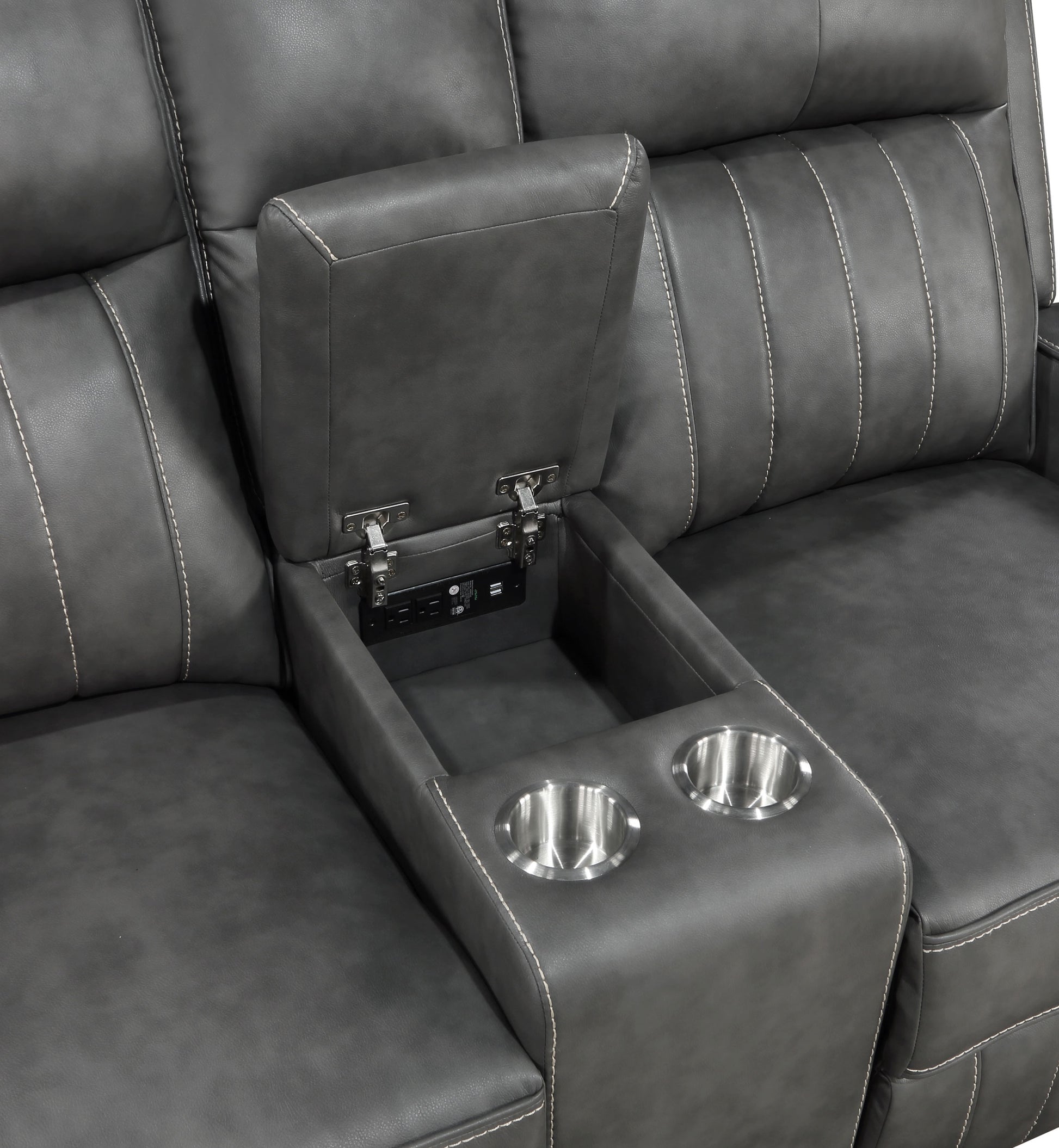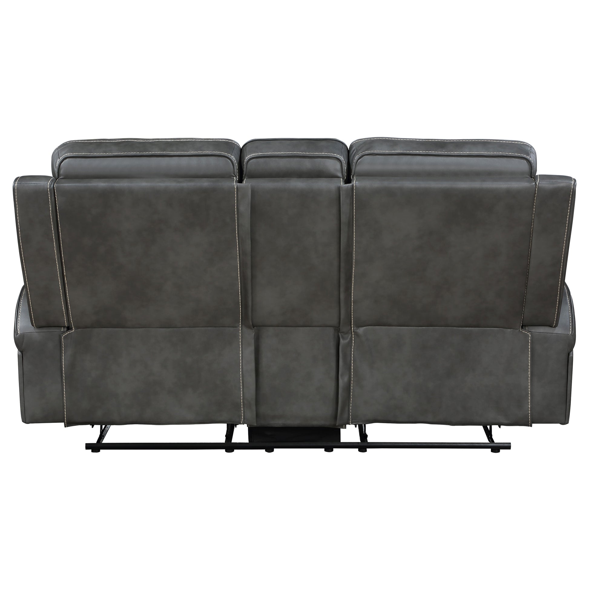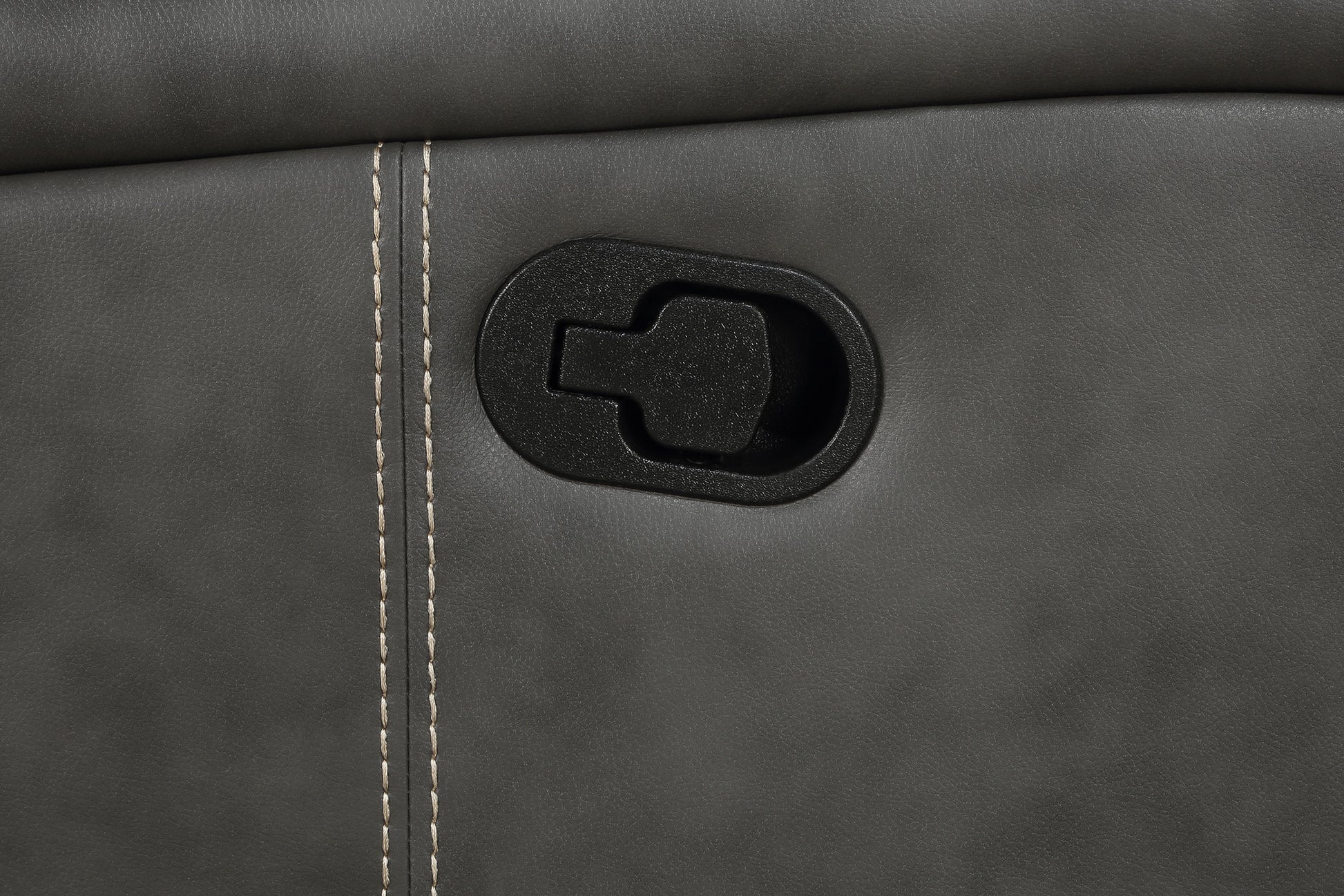 Merging the classic style of both contemporary and transitional design schemes, the motion loveseat creates a dreamy venue for relaxing and entertaining. Choose a pleasing motion loveseat covered in smooth grey leatherette upholstery with vertical topstitching adding decorative elements and a dimensional impact. This loveseat features foam padding on its frame and pocket coil spring seat cushions, as attached back cushions are capped with ultra-plump headrests. Recline into varying positions using a manual control function, and enjoy space efficiency with its wall-hugger design. A convenient center unit features a flip-top console for storing remotes and accessories, and two cup holders to keep beverages handy.