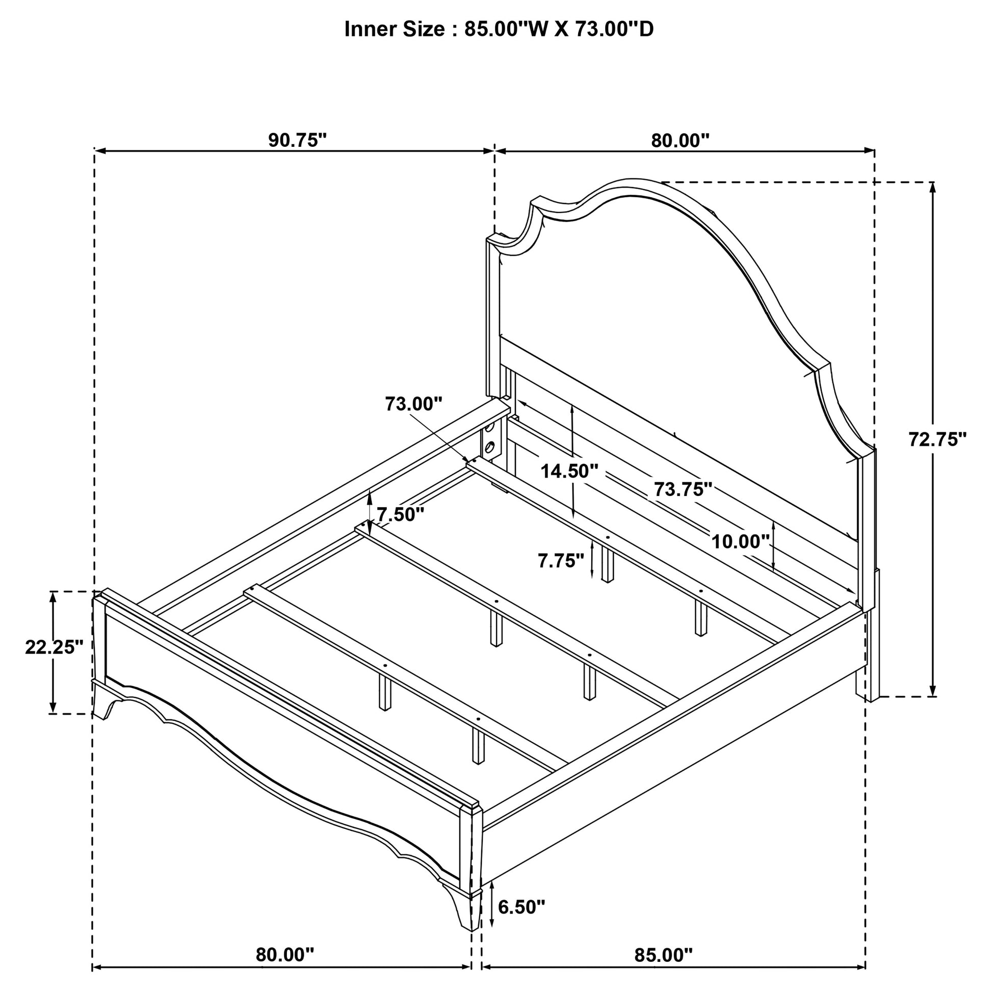 • Scalloped footboard and curved edges showcase French Provincial charm