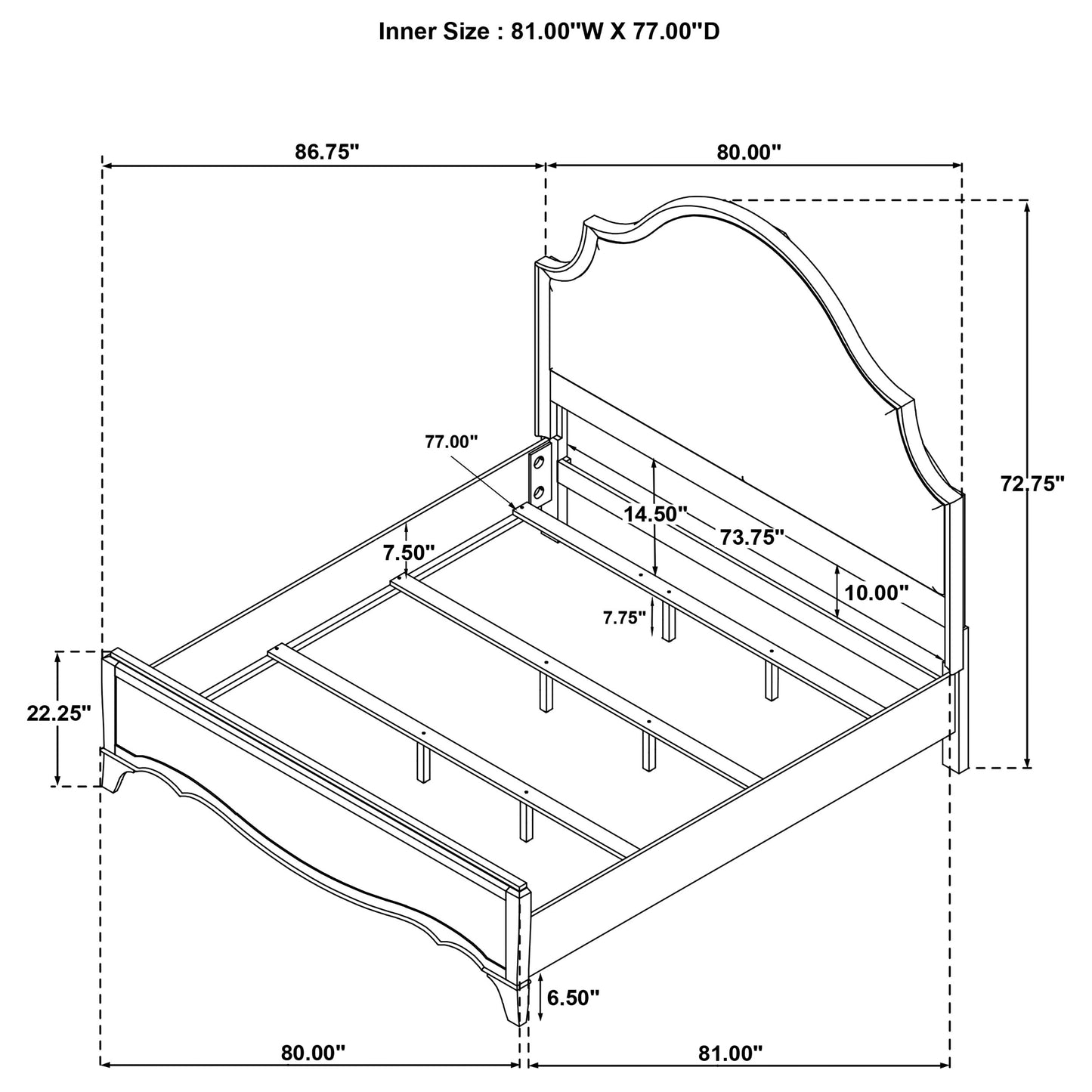 This French Provincial-inspired bed blends timeless elegance with modern craftsmanship. The arched headboard features an ecru fabric upholstered panel, framed by a gracefully curved solid poplar and engineered wood structure. A washed mango veneer finish enhances the natural grain, complementing the scalloped detailing on the footboard. Built with sturdy materials, this bed offers durability and refined style for a sophisticated bedroom setting.