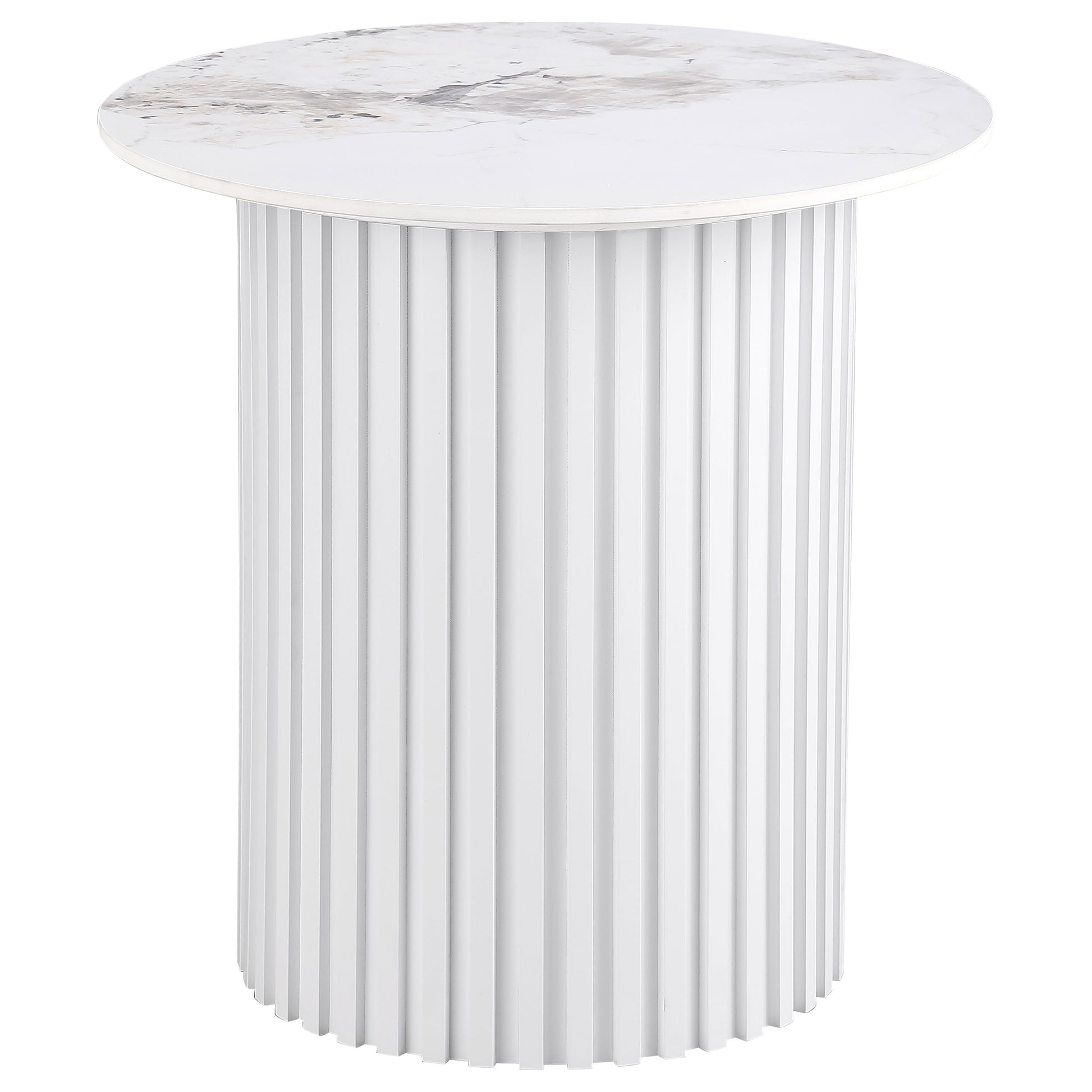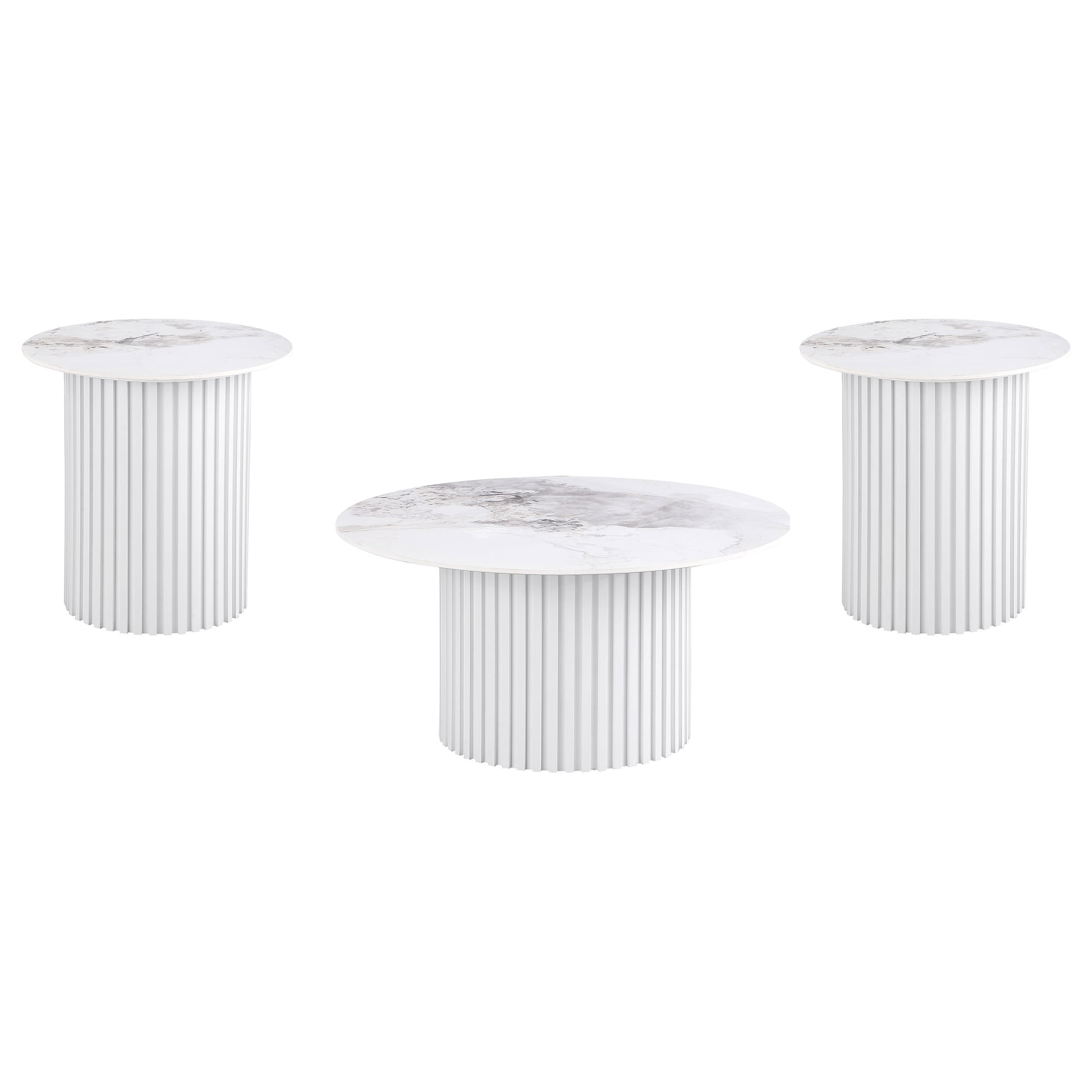 This coffee table set combines modern design with durable materials, featuring sintered stone tops with elegant veining for a sophisticated touch. Fluted metal bases in a white powder-coated finish provide sturdy support and cohesive style. Including a coffee table, and end / side table, this set offers versatility and functionality. Perfect for contemporary living spaces, it blends practicality with refined craftsmanship.