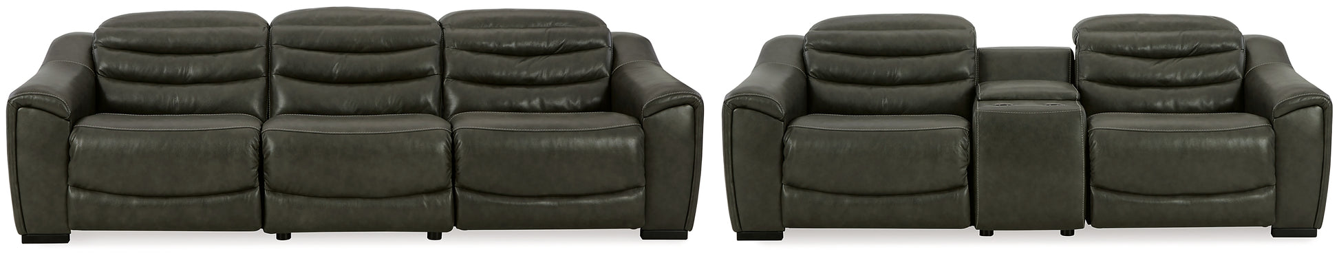 Details | U63404S5: Includes 3 pieces: left-arm facing power recliner, armless chair and right-arm facing power recliner, "Left-arm" and "right-arm" describe the position of the arm when you face the piece, One-touch power control with adjustable positions, Easy View™ adjustable headrest and zero-draw USB port, Zero-draw technology only consumes power when the USB receptacle is in use, Corner-blocked frame with metal reinforced seat, Attached cushions, High-quality foam cushions wrapped in poly fiber, 100% top grain leather covers inside areas such as the back, seat and arm cushions; skillfully matched faux leather covers the remaining areas, Due to its natural origin, real leather can show individual characteristics such as healed scars, growth marks, grain variation and shade variation, Natural variations make each hide unique and do not detract from the wearing qualities of leather, Zero wall recliner design requires minimal space between wall and chair back, Power cord included; UL Listed, U63404S2: Includes 3 pieces: left-arm facing power recliner, console with storage and right-arm facing power recliner, "Left-arm" and "right-arm" describe the position of the arm when you face the piece, One-touch power control with adjustable positions, Easy View™ adjustable headrest and zero-draw USB port, Zero-draw technology only consumes power when the USB receptacle is in use, Corner-blocked frame with metal reinforced seat, Attached cushions, High-quality foam cushions wrapped in poly fiber, 100% top grain leather covers inside areas such as the back, seat and arm cushions; skillfully matched faux leather covers the remaining areas, Due to its natural origin, real leather can show individual characteristics such as healed scars, growth marks, grain variation and shade variation, Natural variations make each hide unique and do not detract from the wearing qualities of leather, Console with 2 cup holders, hidden storage, dual 110V outlets and dual USB charging ports, Zero wall recliner design requires minimal space between wall and chair back, Power cord included; UL Listed, | |