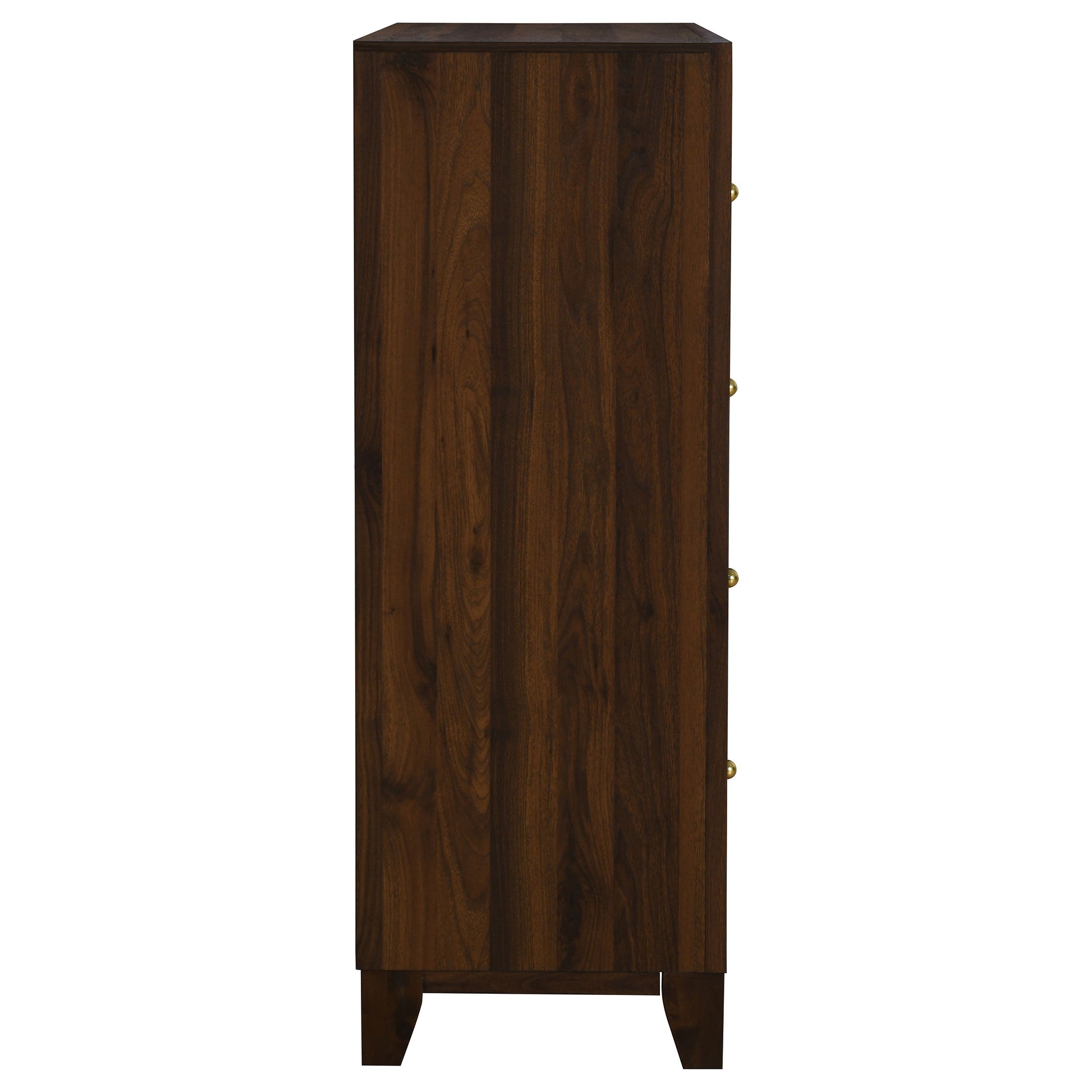 Put finishing touches on your bedroom storage ensemble with this modern five-drawer chest. It offers a refined look and feel with its walnut wood grain finish and contrasting warm gold finish round knobs. The chest is made from durable engineered wood and laminate surface that are designed to resist scratches and dents. It provides a roomy top, great for decor that brings a personal touch in your bedroom. The chest is complete with a precise, structured look and feel, augmented with mitered trim and angular tapered block legs.