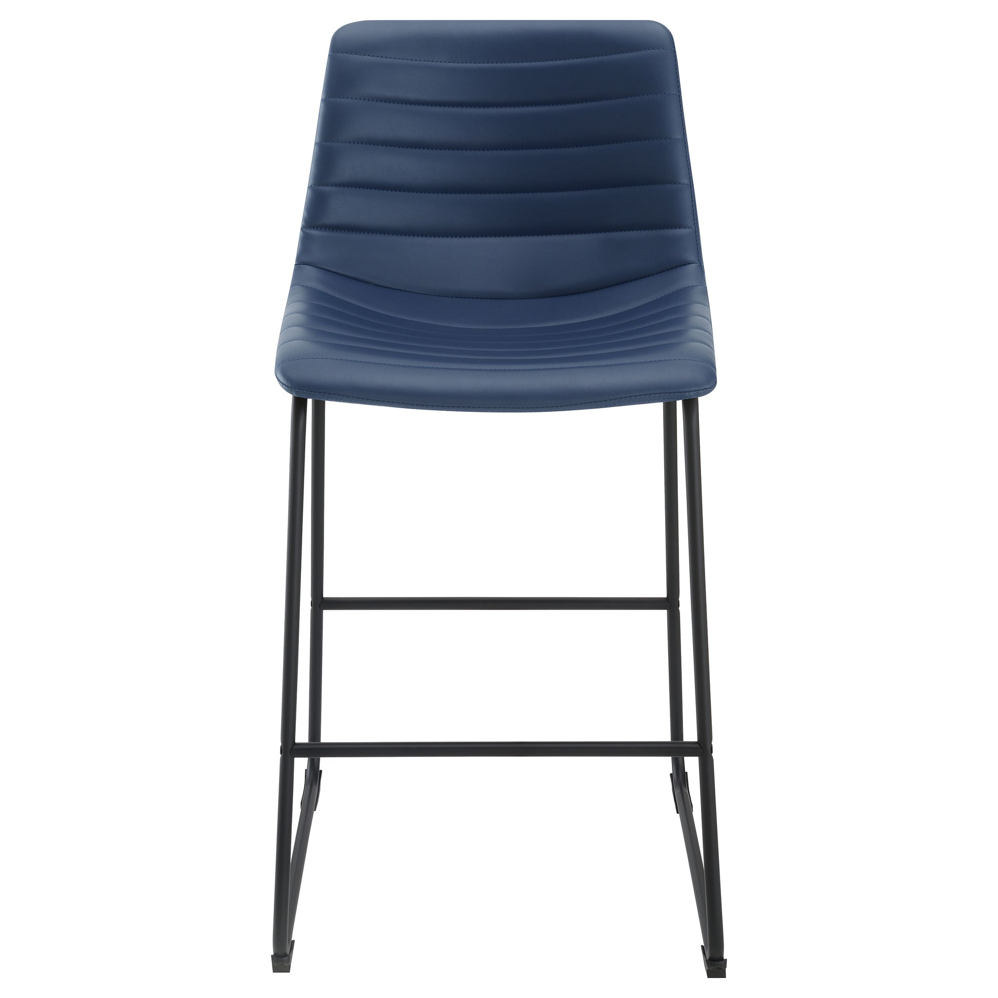 You'll love the upgraded ambiance of a set of two contemporary barstools in your kitchen or home lounge. Each counter stool shows off faux leather upholstery over a bucket style seat for inviting comfort. Beautiful color is highlighted with channel tufting that adds a sense of depth and movement. Footrests straight and smooth, assuring comfortable support for friends and family. Each stool stands on a black finish metal base with a sled design and plastic glides to protect flooring.